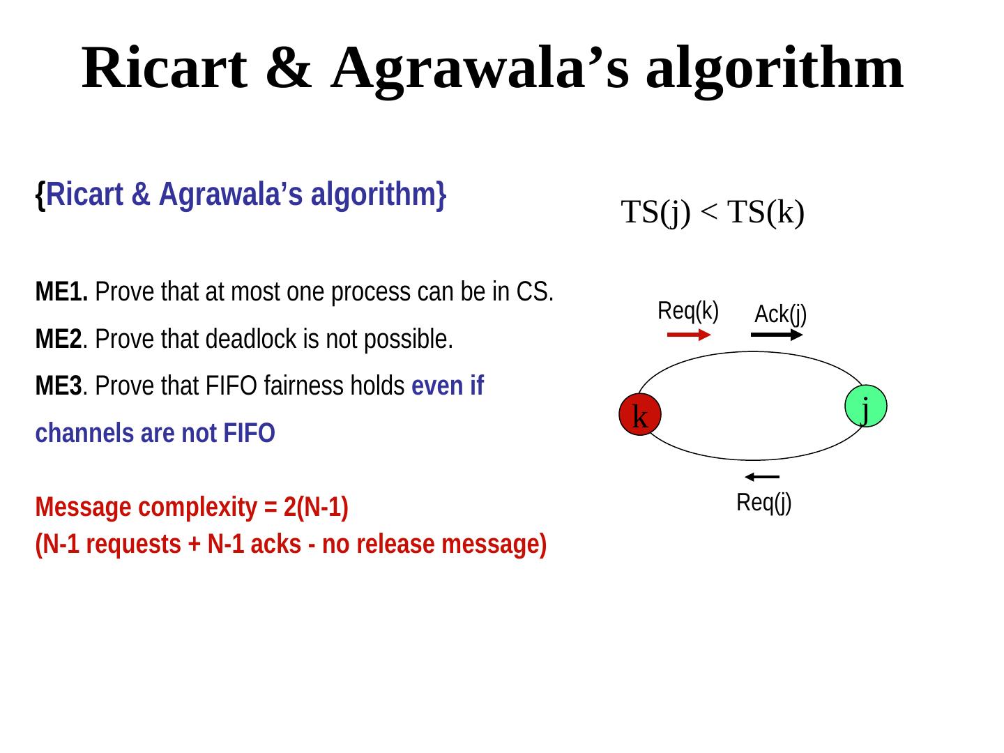 13 . Ricart & Agrawala’s algorithm {Ricart & Agrawala’s algorithm} TS(j) < TS(k) ME1. Prove that at most one process can be in CS. Req(k) Ack(j) ME2. Prove that deadlock is not possible. ME3. Prove that FIFO fairness holds even if k j channels are not FIFO Message complexity = 2(N-1) Req(j) (N-1 requests + N-1 acks - no release message)
