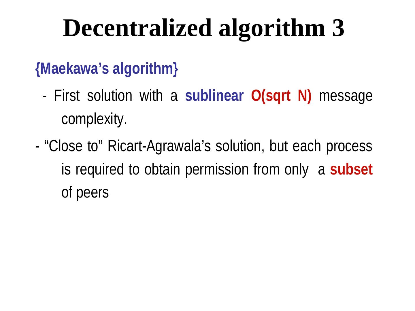 15 . Decentralized algorithm 3 {Maekawa’s algorithm} - First solution with a sublinear O(sqrt N) message complexity. - “Close to” Ricart-Agrawala’s solution, but each process is required to obtain permission from only a subset of peers