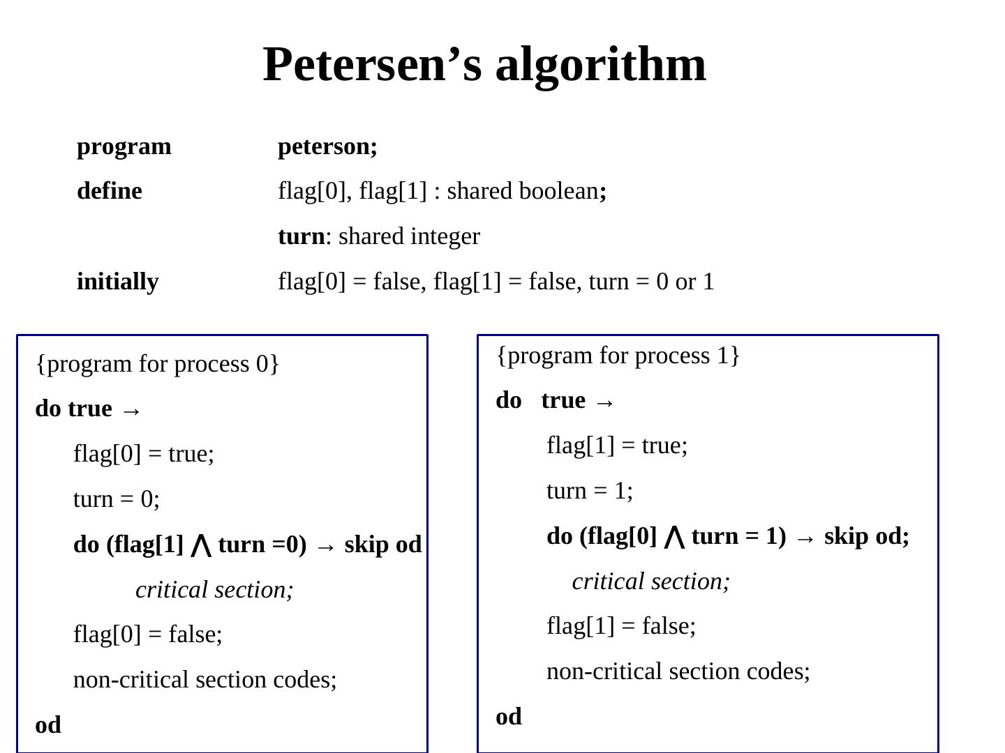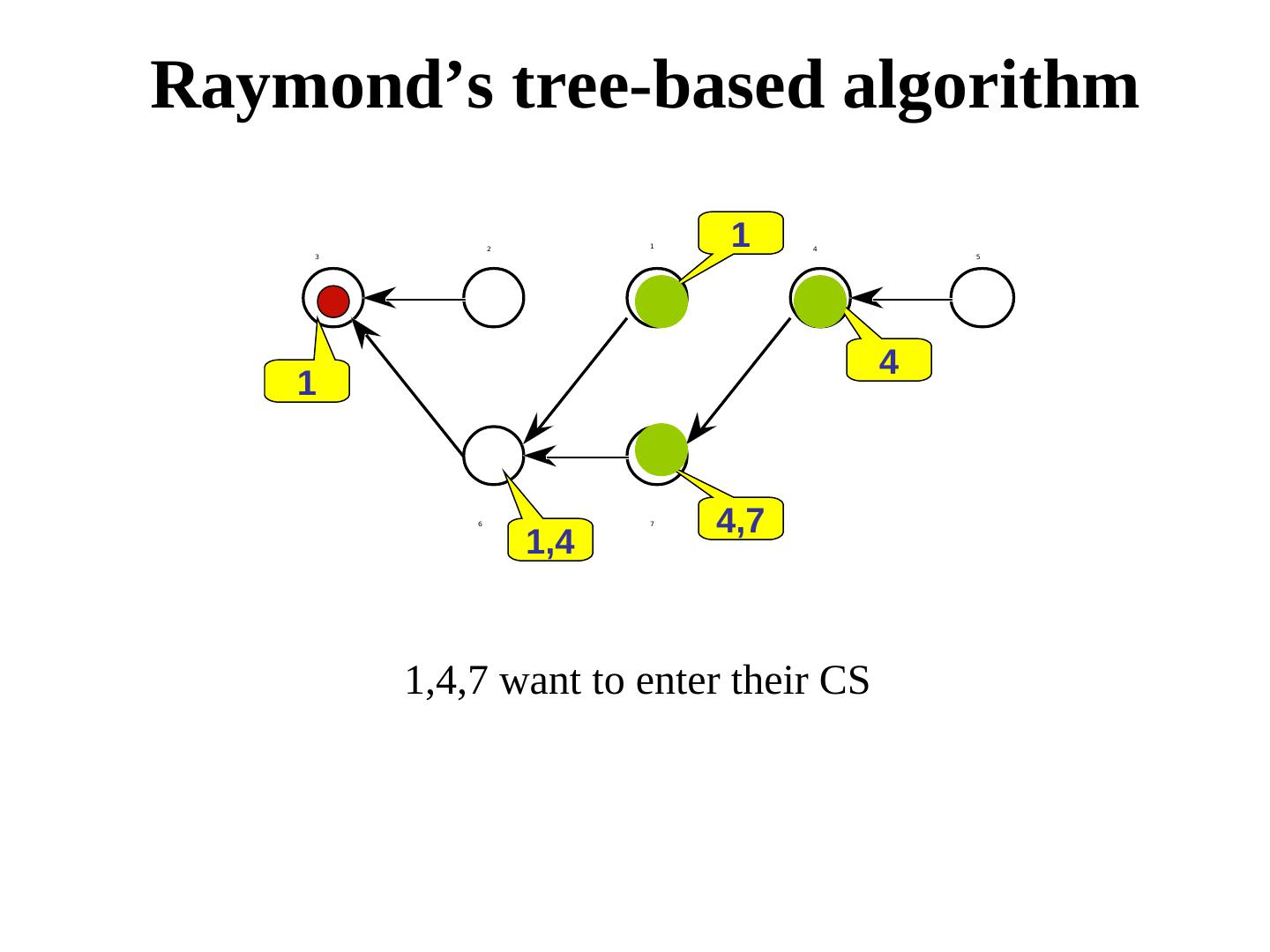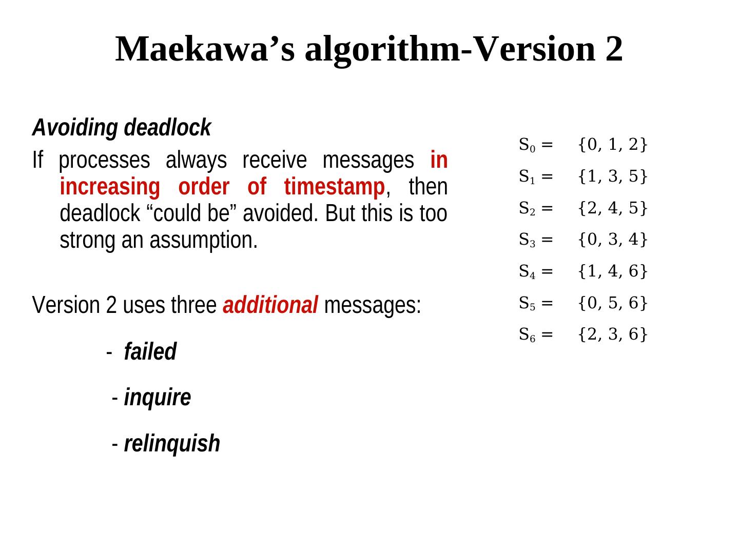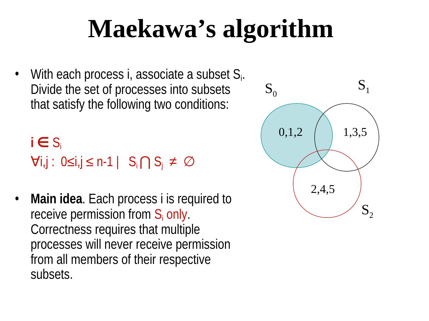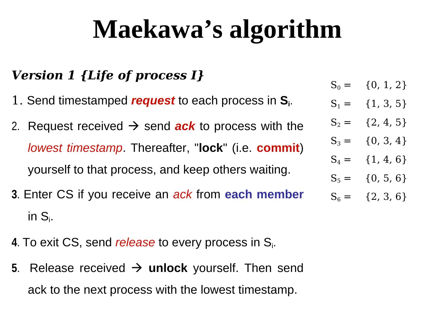 17 . Maekawa’s algorithm Example. Let there be seven processes 0, 1, 2, 3, 4, 5, 6 S0 = {0, 1, 2} S1 = {1, 3, 5} S2 = {2, 4, 5} S3 = {0, 3, 4} S4 = {1, 4, 6} S5 = {0, 5, 6} S6 = {2, 3, 6}