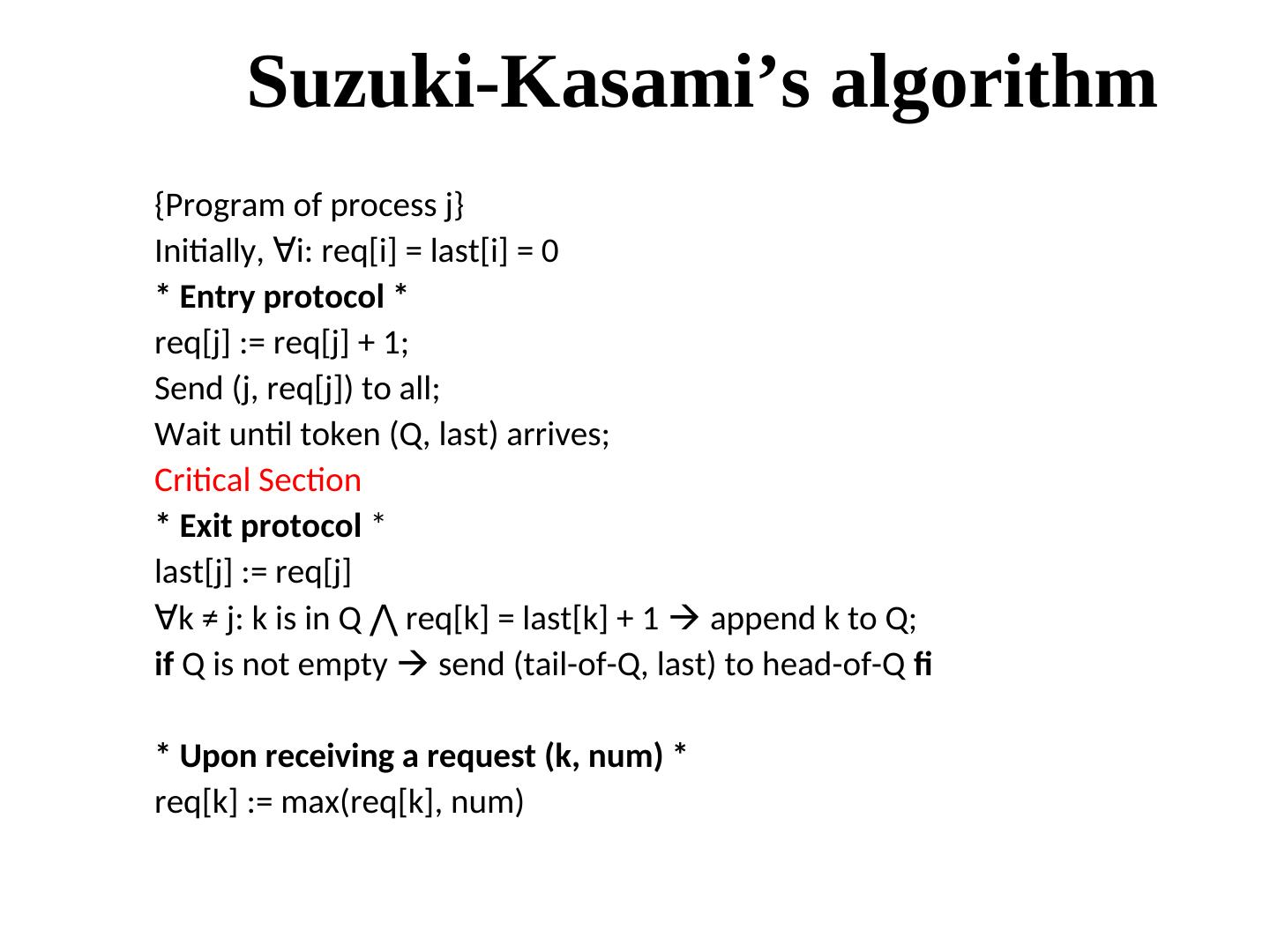 28 . Suzuki-Kasami’s algorithm {Program of process j} Initially, ∀i: req[i] = last[i] = 0 * Entry protocol * req[j] := req[j] + 1; Send (j, req[j]) to all; Wait until token (Q, last) arrives; Critical Section * Exit protocol * last[j] := req[j] ∀k ≠ j: k is in Q ⋀ req[k] = last[k] + 1 req[k] = last[k] + 1 append k to Q; if Q is not empty send (tail-of-Q, last) to head-of-Q fi * Upon receiving a request (k, num) * req[k] := max(req[k], num)