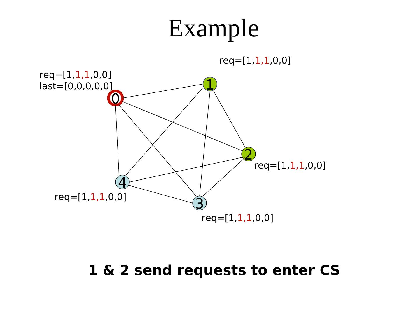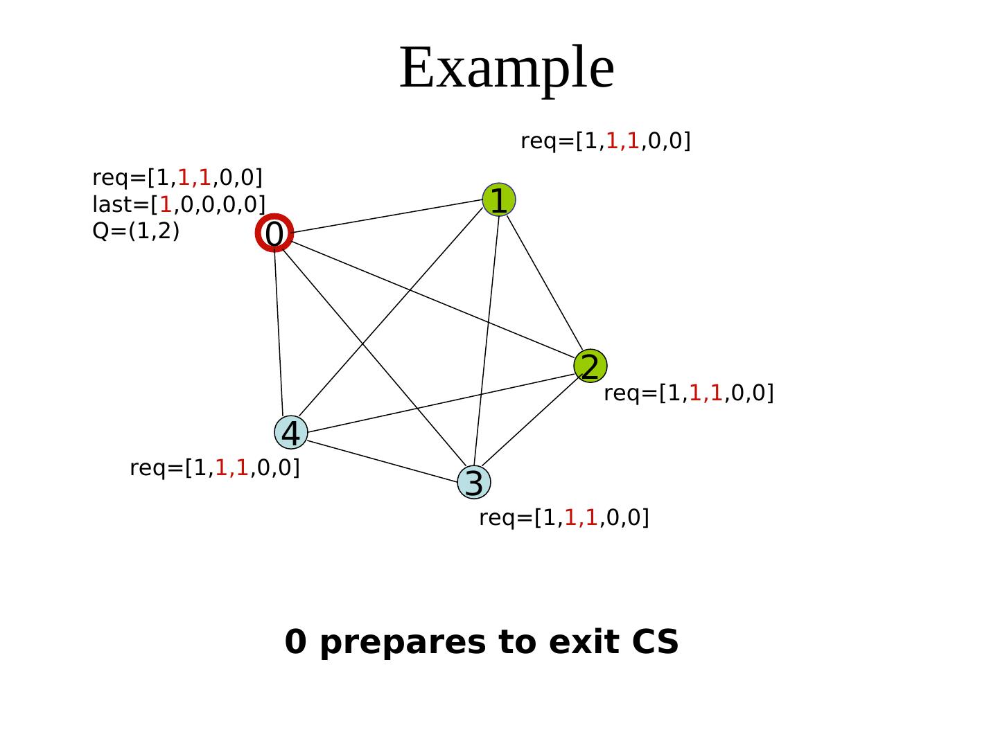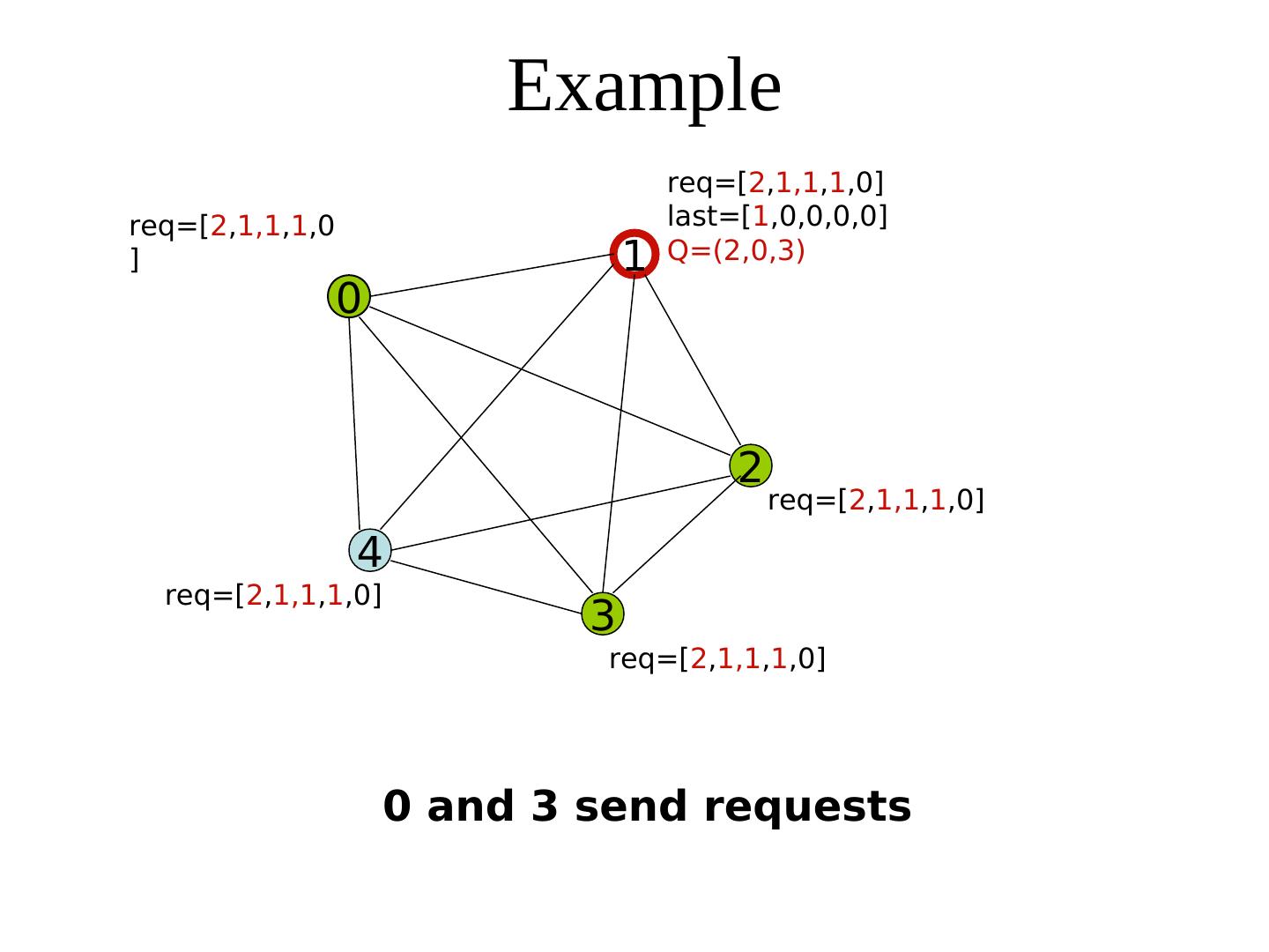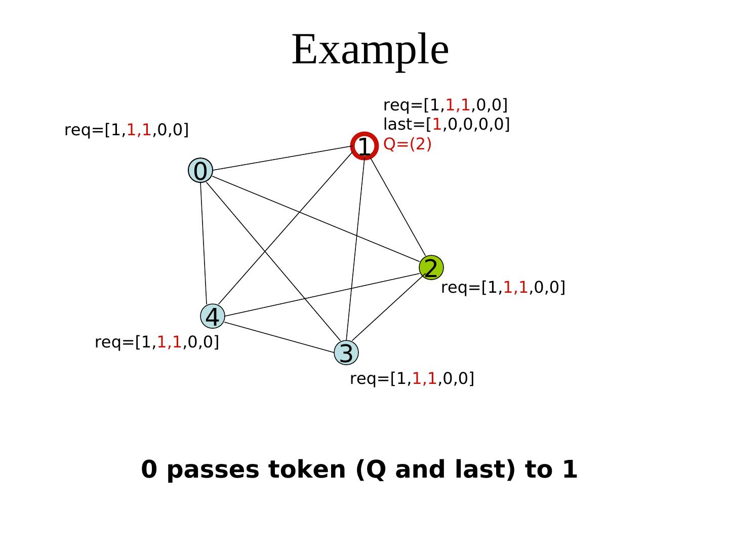 29 . Example req=[1,0,0,0,0] req=[1,0,0,0,0] last=[0,0,0,0,0] 1 0 2 req=[1,0,0,0,0] 4 req=[1,0,0,0,0] 3 req=[1,0,0,0,0] initial state: process 0 has sent a request to all, and grabbed the token