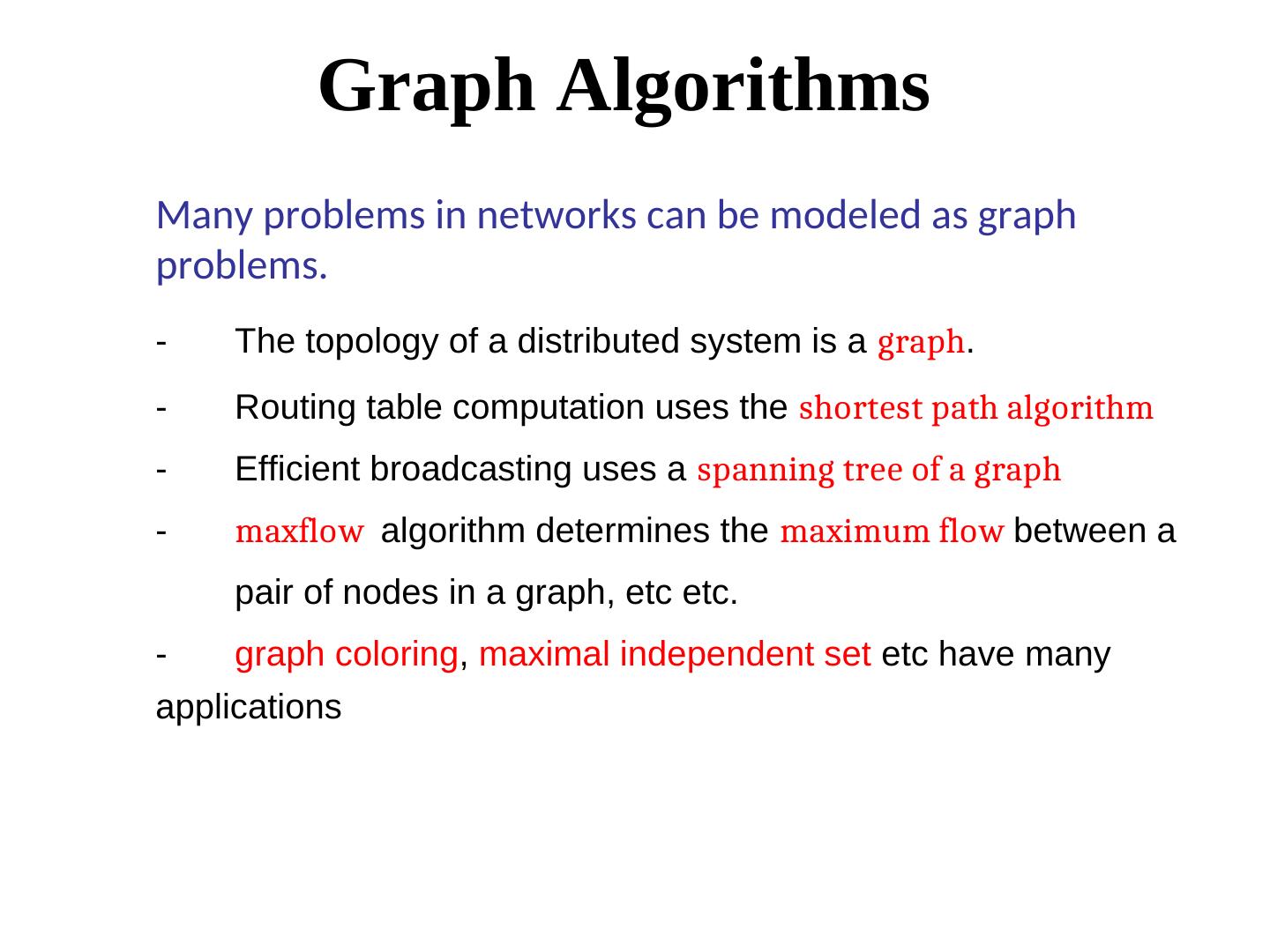 2 . Graph Algorithms Many problems in networks can be modeled as graph problems. - The topology of a distributed system is a graph. - Routing table computation uses the shortest path algorithm - Efficient broadcasting uses a spanning tree of a graph - maxflow algorithm determines the maximum flow between a pair of nodes in a graph, etc etc. - graph coloring, maximal independent set etc have many applications