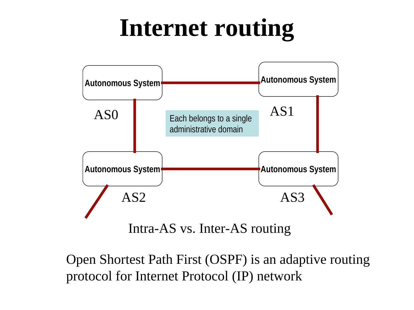 4 . Internet routing Autonomous System Autonomous System AS0 Each belongs to a single AS1 administrative domain Autonomous System Autonomous System AS2 AS3 Intra-AS vs. Inter-AS routing Open Shortest Path First (OSPF) is an adaptive routing protocol for Internet Protocol (IP) network