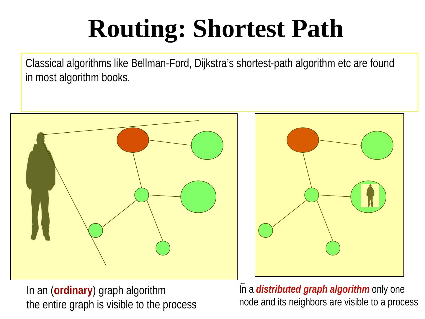 5 . Routing: Shortest Path Classical algorithms like Bellman-Ford, Dijkstra’s shortest-path algorithm etc are found in most algorithm books. In an (ordinary) graph algorithm In a distributed graph algorithm only one the entire graph is visible to the process node and its neighbors are visible to a process