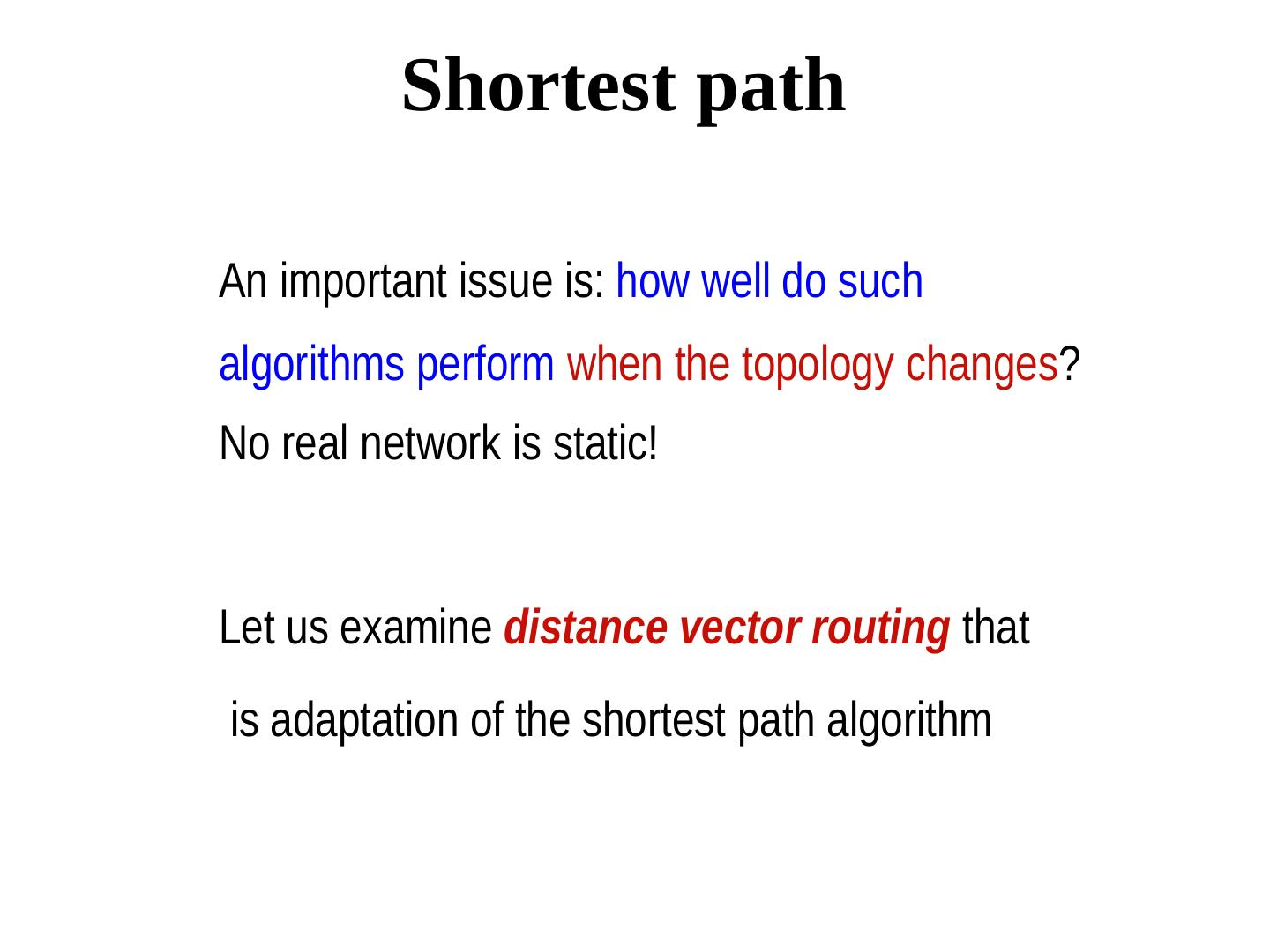 11 . Shortest path An important issue is: how well do such algorithms perform when the topology changes? No real network is static! Let us examine distance vector routing that is adaptation of the shortest path algorithm