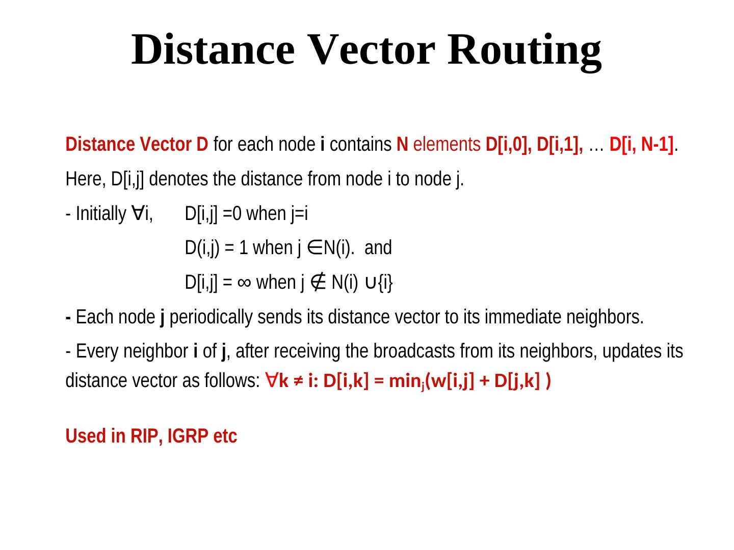 12 . Distance Vector Routing Distance Vector D for each node i contains N elements D[i,0], D[i,1], … D[i, N-1]. Here, D[i,j] denotes the distance from node i to node j. - Initially ∀i ≠ 0, i, D[i,j] =0 when j=i D(i,j) = 1 when j ∈N(i). and N(i). and D[i,j] = ∞ when j ∉ N(i) ∪{i} N(i) ∪{i}{i} - Each node j periodically sends its distance vector to its immediate neighbors. - Every neighbor i of j, after receiving the broadcasts from its neighbors, updates its distance vector as follows: ∀i ≠ 0, k ≠ i: D[i,k] = minj(w[i,j] + D[j,k] ) Used in RIP, IGRP etc