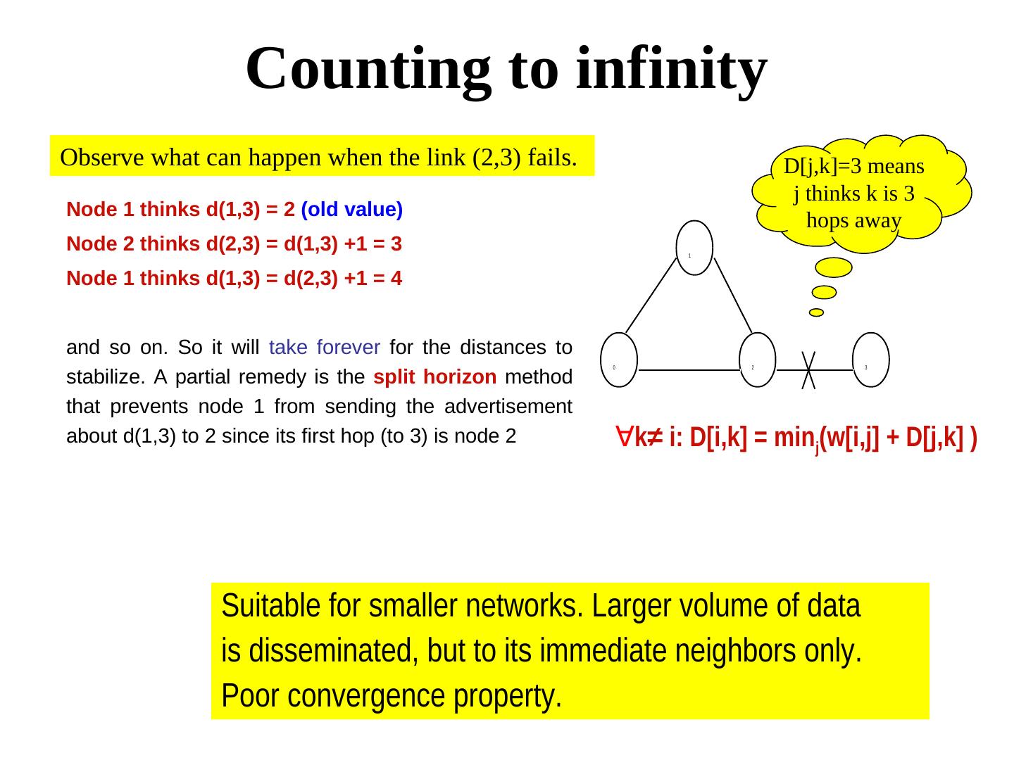 15 . Counting to infinity Observe what can happen when the link (2,3) fails. D[j,k]=3 means j thinks k is 3 Node 1 thinks d(1,3) = 2 (old value) hops away Node 2 thinks d(2,3) = d(1,3) +1 = 3 1 Node 1 thinks d(1,3) = d(2,3) +1 = 4 and so on. So it will take forever for the distances to 0 2 3 stabilize. A partial remedy is the split horizon method that prevents node 1 from sending the advertisement about d(1,3) to 2 since its first hop (to 3) is node 2 ∀i ≠ 0, k≠ i: D[i,k] = minj(w[i,j] + D[j,k] ) Suitable for smaller networks. Larger volume of data is disseminated, but to its immediate neighbors only. Poor convergence property.