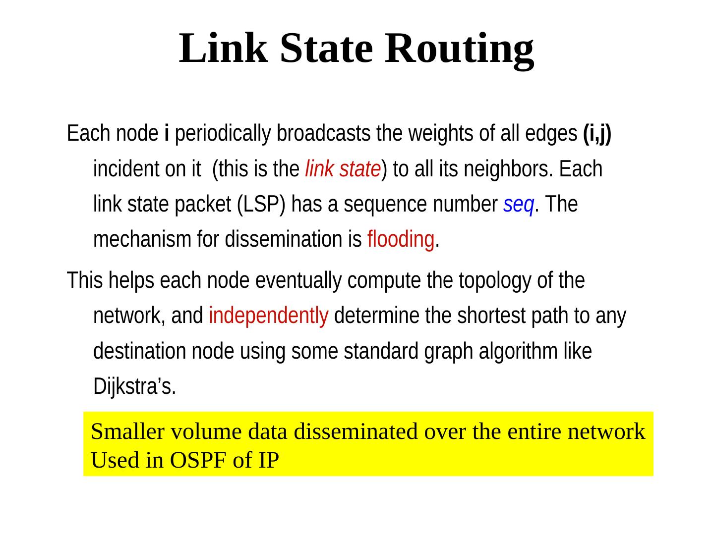 16 . Link State Routing Each node i periodically broadcasts the weights of all edges (i,j) incident on it (this is the link state) to all its neighbors. Each link state packet (LSP) has a sequence number seq. The mechanism for dissemination is flooding. This helps each node eventually compute the topology of the network, and independently determine the shortest path to any destination node using some standard graph algorithm like Dijkstra’s. Smaller volume data disseminated over the entire network Used in OSPF of IP