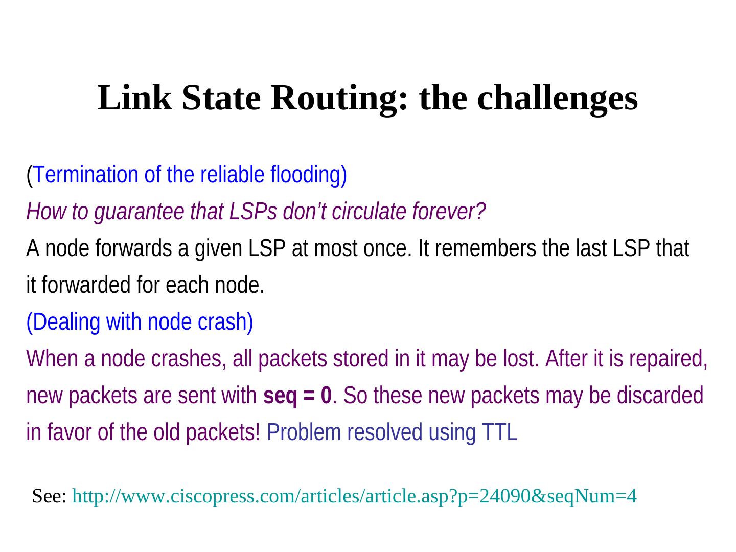 17 . Link State Routing: the challenges (Termination of the reliable flooding) How to guarantee that LSPs don’t circulate forever? A node forwards a given LSP at most once. It remembers the last LSP that it forwarded for each node. (Dealing with node crash) When a node crashes, all packets stored in it may be lost. After it is repaired, new packets are sent with seq = 0. So these new packets may be discarded in favor of the old packets! Problem resolved using TTL See: http://www.ciscopress.com/articles/article.asp?p=24090&seqNum=4