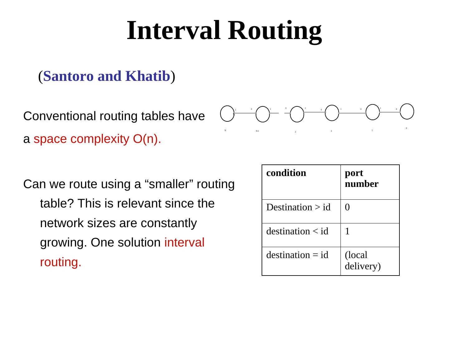 18 . Interval Routing (Santoro and Khatib) 0 1 0 1 1 0 1 0 1 0 Conventional routing tables have 0 N N-1 2 1 3 a space complexity O(n). condition port Can we route using a “smaller” routing number table? This is relevant since the Destination > id 0 network sizes are constantly destination < id 1 growing. One solution interval destination = id (local routing. delivery)