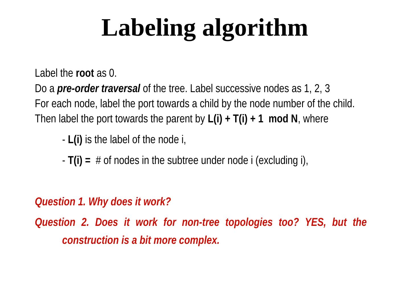 21 . Labeling algorithm Label the root as 0. Do a pre-order traversal of the tree. Label successive nodes as 1, 2, 3 For each node, label the port towards a child by the node number of the child. Then label the port towards the parent by L(i) + T(i) + 1 mod N, where - L(i) is the label of the node i, - T(i) = # of nodes in the subtree under node i (excluding i), Question 1. Why does it work? Question 2. Does it work for non-tree topologies too? YES, but the construction is a bit more complex.