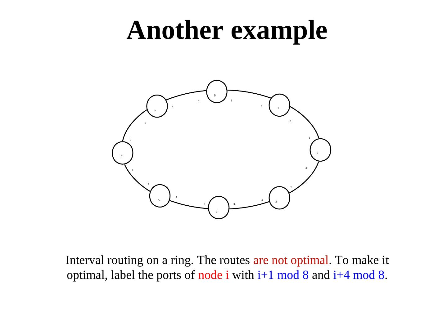 22 . Another example 0 7 1 0 0 1 7 2 6 1 7 2 6 3 5 6 2 4 5 4 3 5 3 4 Interval routing on a ring. The routes are not optimal. To make it optimal, label the ports of node i with i+1 mod 8 and i+4 mod 8.