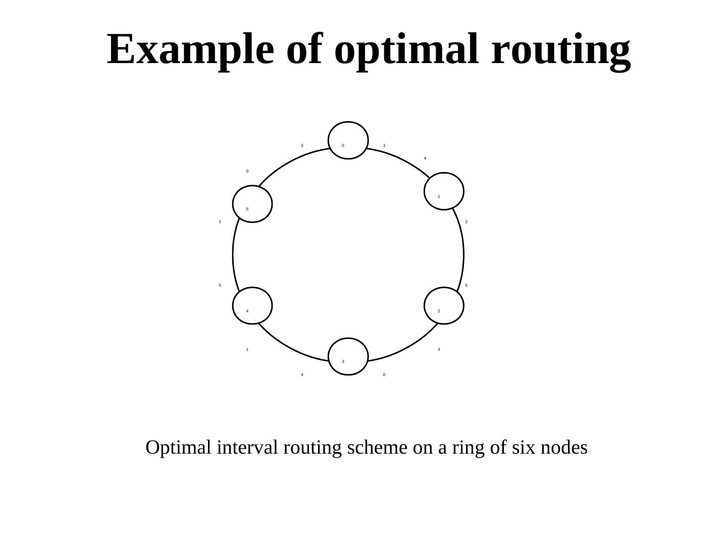 23 .Example of optimal routing 3 0 1 4 0 1 5 2 2 5 5 4 2 1 3 3 4 0 Optimal interval routing scheme on a ring of six nodes
