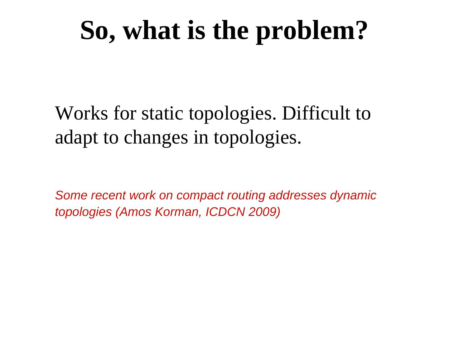 24 . So, what is the problem? Works for static topologies. Difficult to adapt to changes in topologies. Some recent work on compact routing addresses dynamic topologies (Amos Korman, ICDCN 2009)