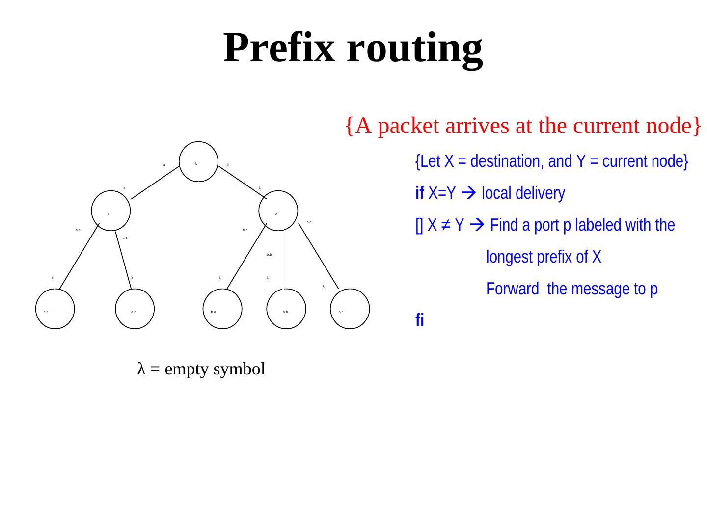 26 . Prefix routing {A packet arrives at the current node} a λ b {Let X = destination, and Y = current node} if X=Y local delivery λ λ a b a.a b.a b.c [] X ≠ Y Find a port p labeled with the a.b b.b longest prefix of X λ λ λ λ λ Forward the message to p fi a.a a.b b.a b.b b.c λ = empty symbol
