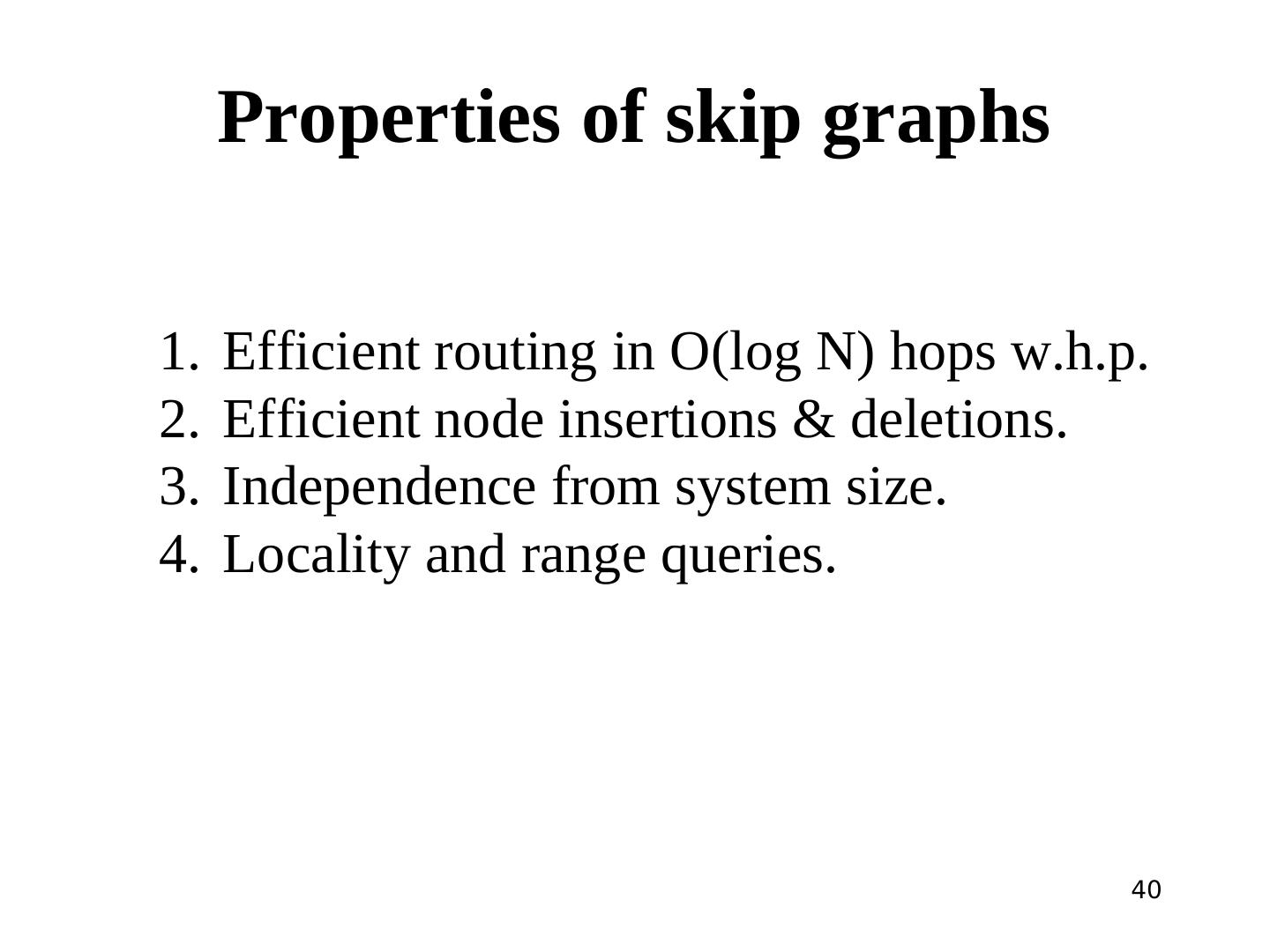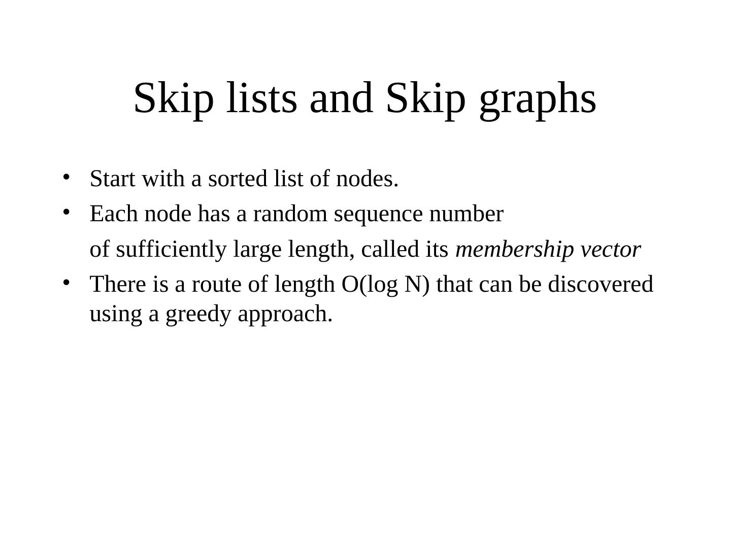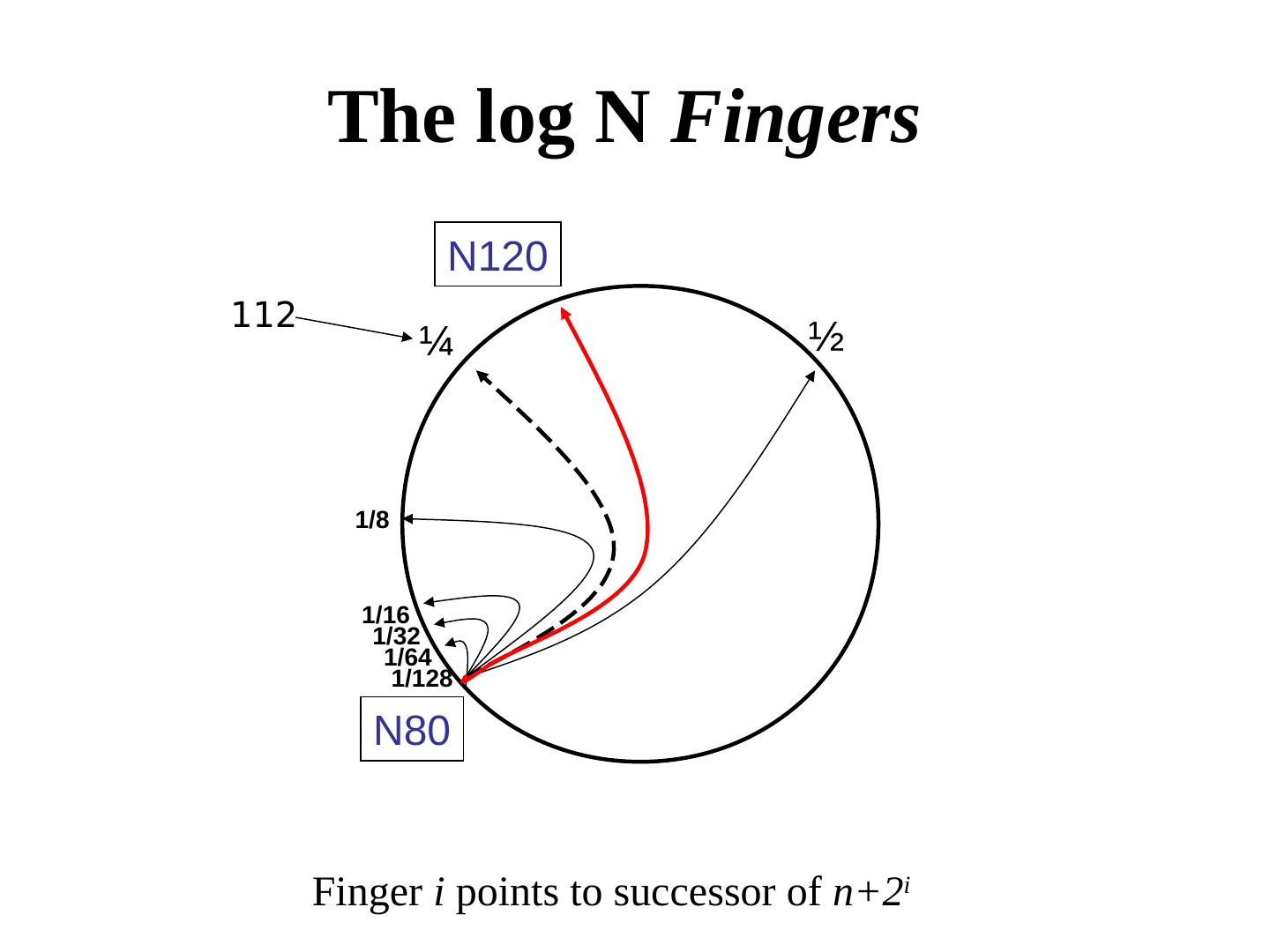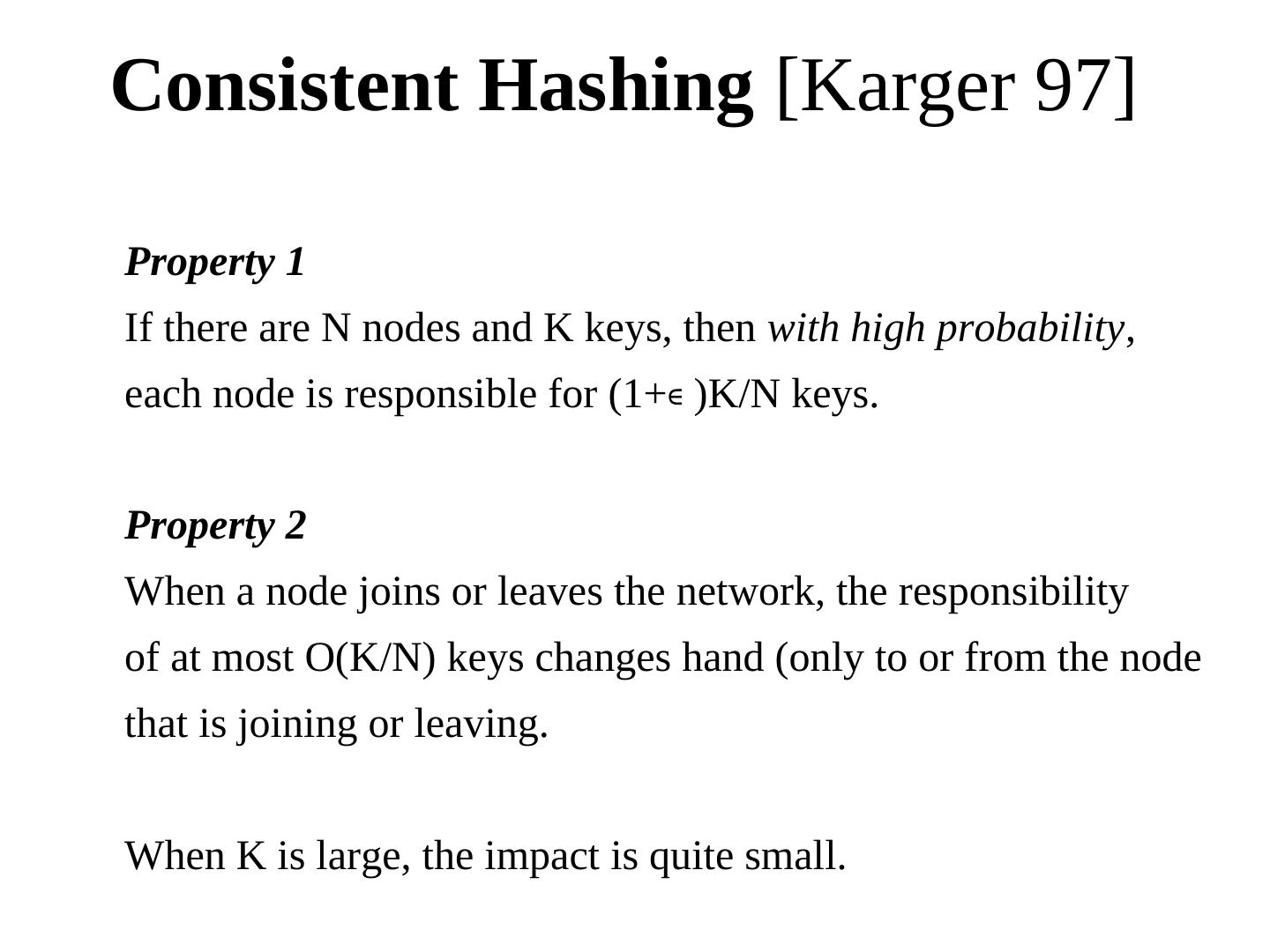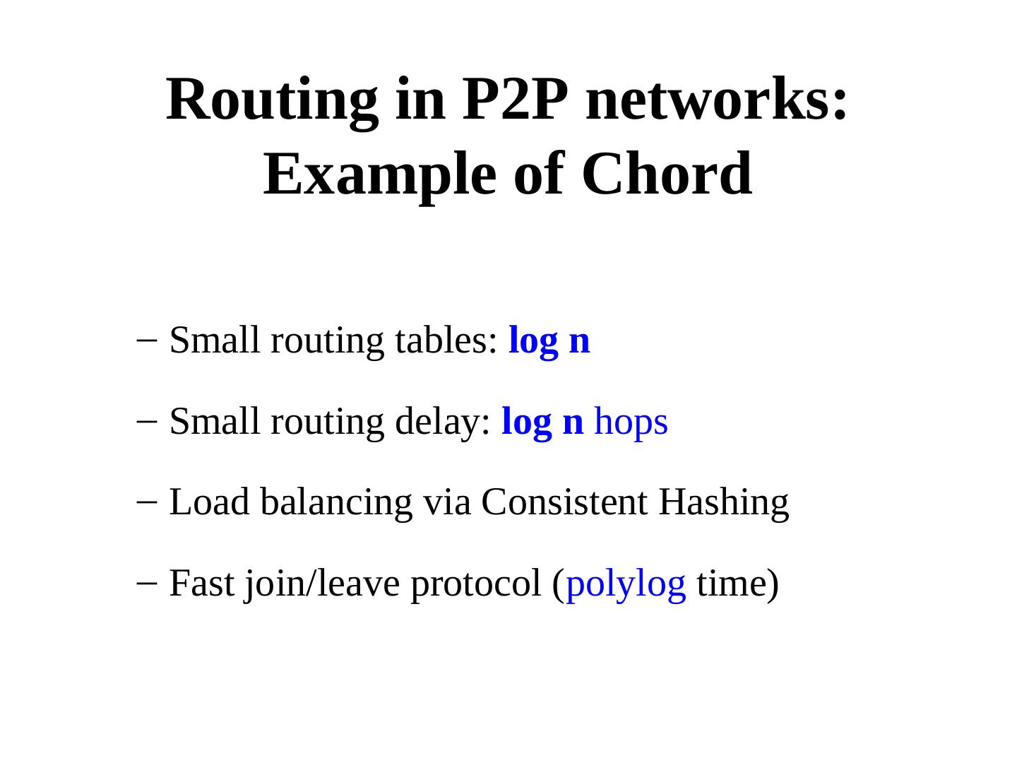 28 . Routing in P2P networks: Example of Chord – Small routing tables: log n – Small routing delay: log n hops – Load balancing via Consistent Hashing – Fast join/leave protocol (polylog time)