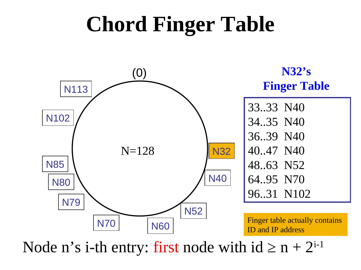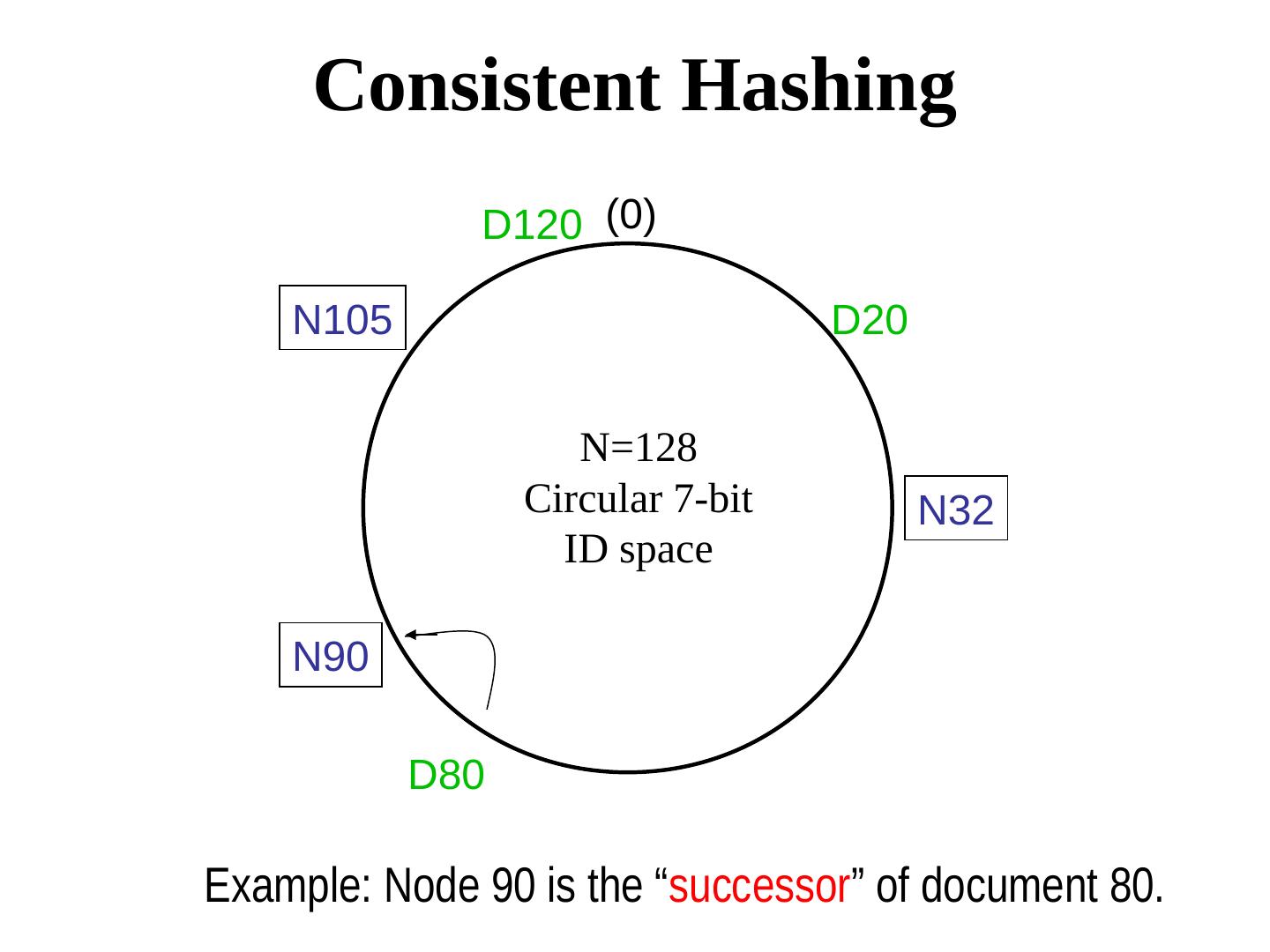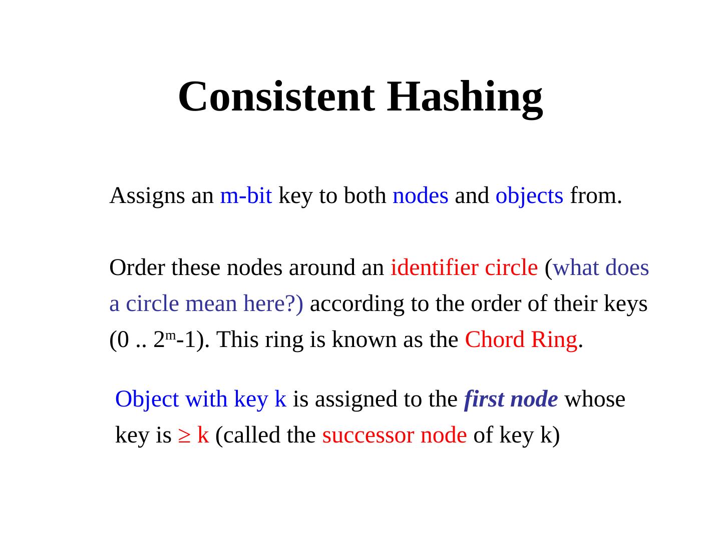 29 . Consistent Hashing Assigns an m-bit key to both nodes and objects from. Order these nodes around an identifier circle (what does a circle mean here?) according to the order of their keys (0 .. 2m-1). This ring is known as the Chord Ring. Object with key k is assigned to the first node whose key is ≥ k (called the successor node of key k)