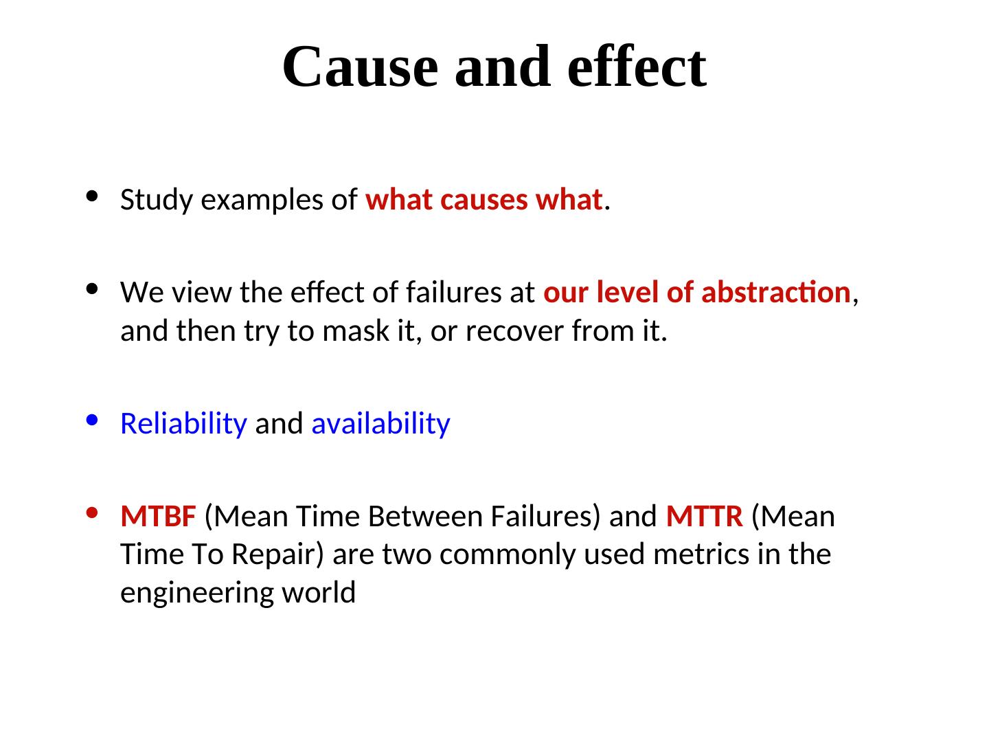 3 . Cause and effect • Study examples of what causes what. • We view the effect of failures at our level of abstraction, and then try to mask it, or recover from it. • Reliability and availability • MTBF (Mean Time Between Failures) and MTTR (Mean Time To Repair) are two commonly used metrics in the engineering world