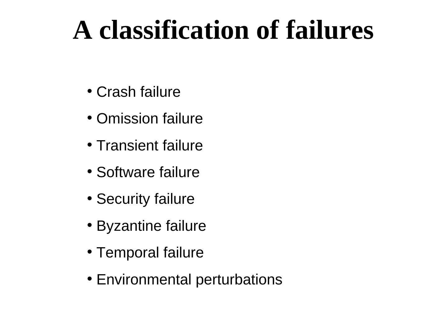 4 .A classification of failures • Crash failure • Omission failure • Transient failure • Software failure • Security failure • Byzantine failure • Temporal failure • Environmental perturbations
