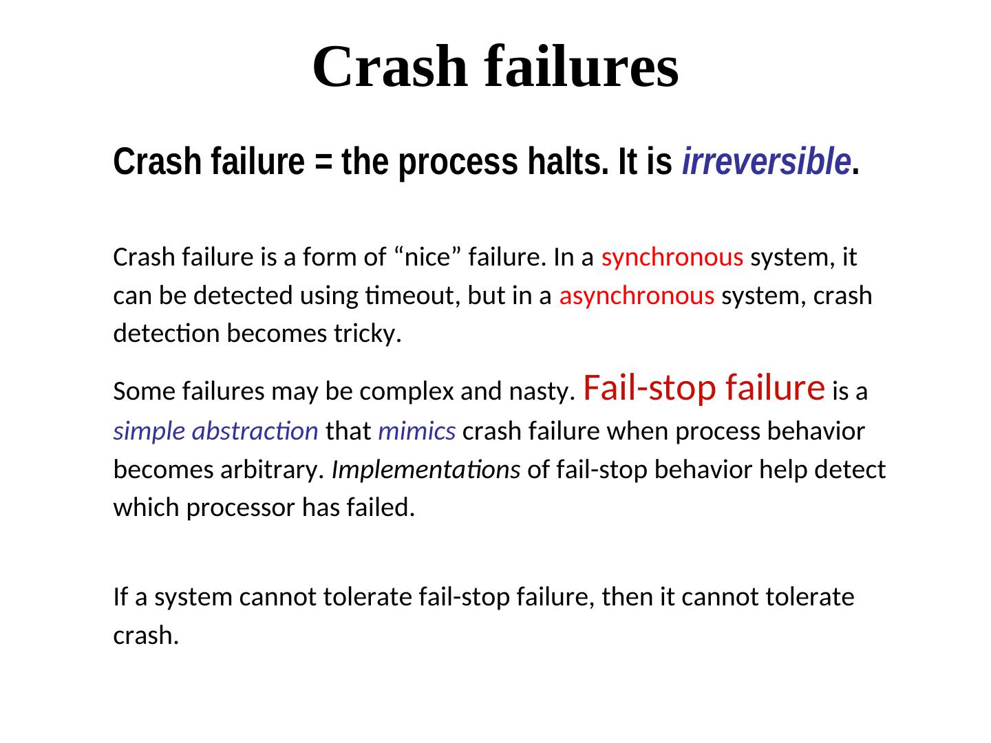 5 . Crash failures Crash failure = the process halts. It is irreversible. Crash failure is a form of “nice” failure. In a synchronous system, it can be detected using timeout, but in a asynchronous system, crash detection becomes tricky. Some failures may be complex and nasty. Fail-stop failure is a simple abstraction that mimics crash failure when process behavior becomes arbitrary. Implementations of fail-stop behavior help detect which processor has failed. If a system cannot tolerate fail-stop failure, then it cannot tolerate crash.