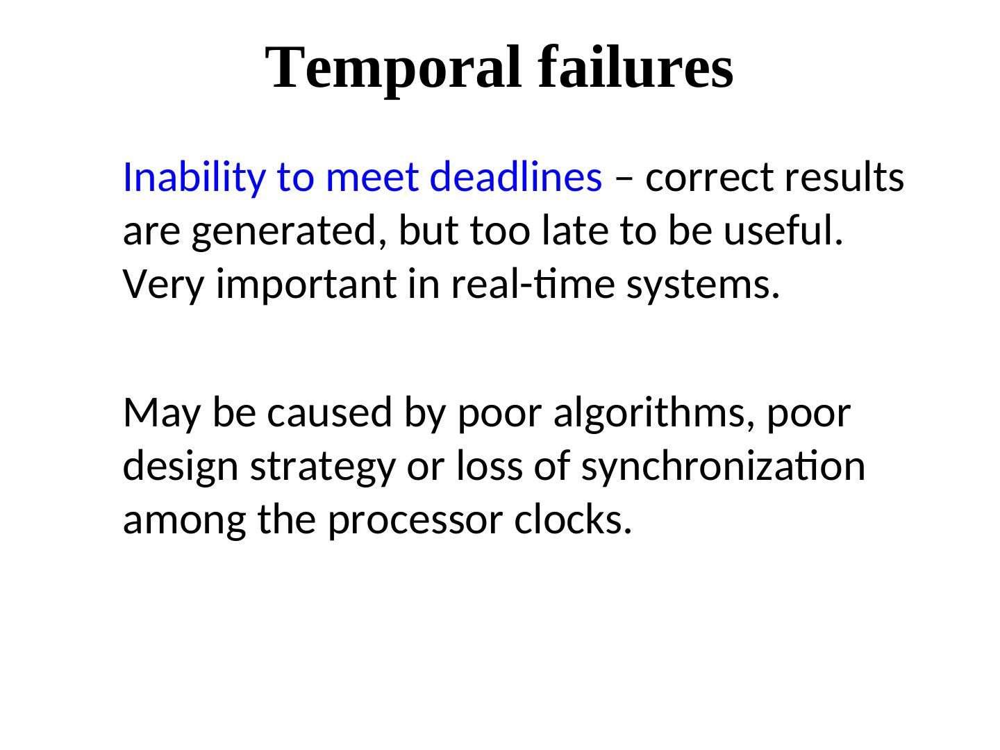 10 . Temporal failures Inability to meet deadlines – correct results are generated, but too late to be useful. Very important in real-time systems. May be caused by poor algorithms, poor design strategy or loss of synchronization among the processor clocks.