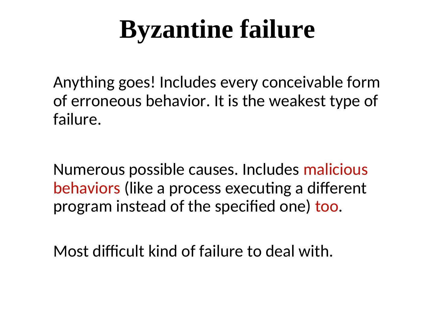 13 . Byzantine failure Anything goes! Includes every conceivable form of erroneous behavior. It is the weakest type of failure. Numerous possible causes. Includes malicious behaviors (like a process executing a different program instead of the specified one) too. Most difficult kind of failure to deal with.