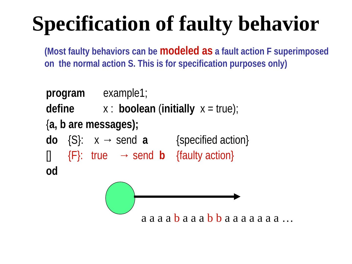 14 .Specification of faulty behavior (Most faulty behaviors can be modeled as a fault action F superimposed on the normal action S. This is for specification purposes only) program example1; define x : boolean (initially x = true); {a, b are messages); do {S}: x → send a {specified action} [] {F}: true → send b {faulty action} od aaaabaaabbaaaaaaa…