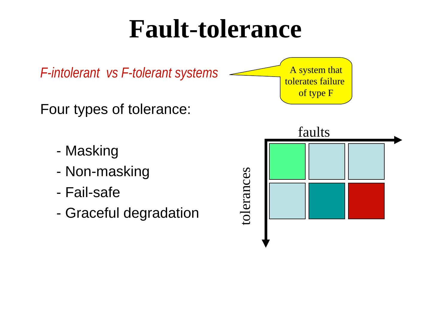 15 . Fault-tolerance F-intolerant vs F-tolerant systems A system that tolerates failure of type F Four types of tolerance: faults - Masking - Non-masking tolerances - Fail-safe - Graceful degradation
