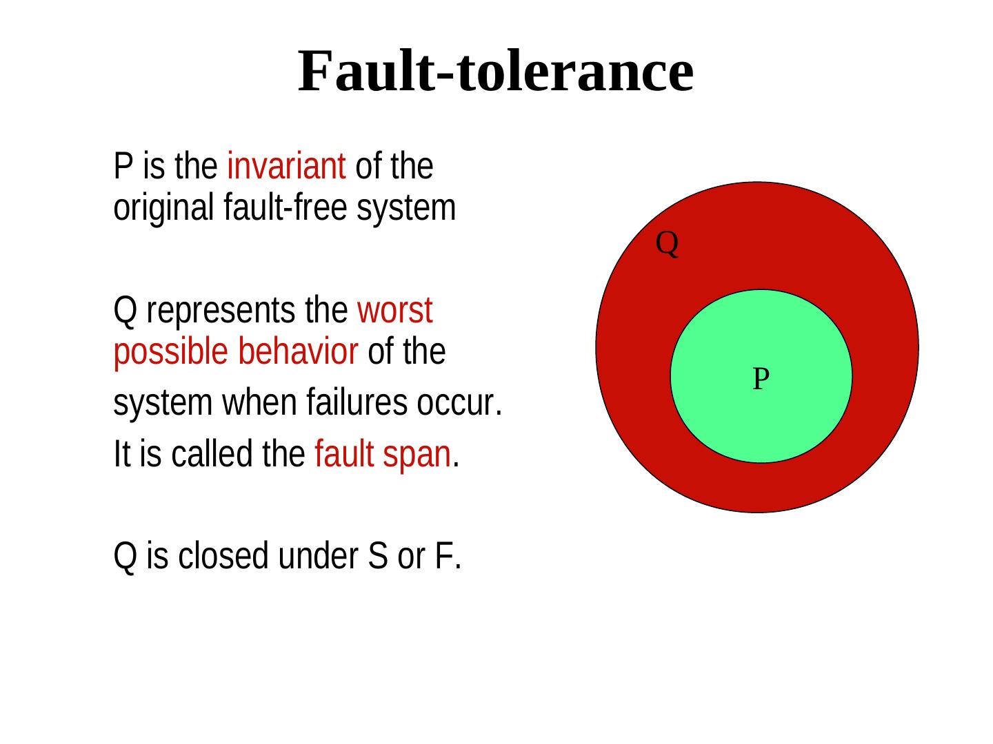 16 . Fault-tolerance P is the invariant of the original fault-free system Q Q represents the worst possible behavior of the P system when failures occur. It is called the fault span. Q is closed under S or F.