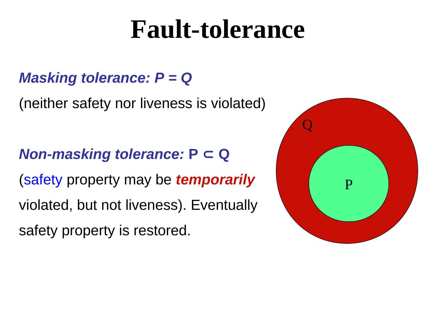 17 . Fault-tolerance Masking tolerance: P = Q (neither safety nor liveness is violated) Q Non-masking tolerance: P ⊂ Q Q (safety property may be temporarily P violated, but not liveness). Eventually safety property is restored.