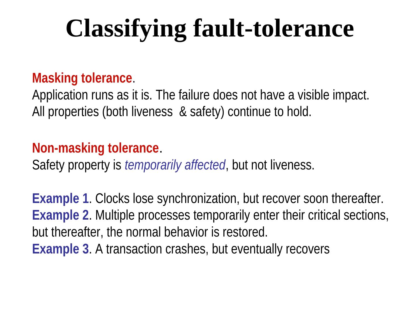 18 . Classifying fault-tolerance Masking tolerance. Application runs as it is. The failure does not have a visible impact. All properties (both liveness & safety) continue to hold. Non-masking tolerance. Safety property is temporarily affected, but not liveness. Example 1. Clocks lose synchronization, but recover soon thereafter. Example 2. Multiple processes temporarily enter their critical sections, but thereafter, the normal behavior is restored. Example 3. A transaction crashes, but eventually recovers