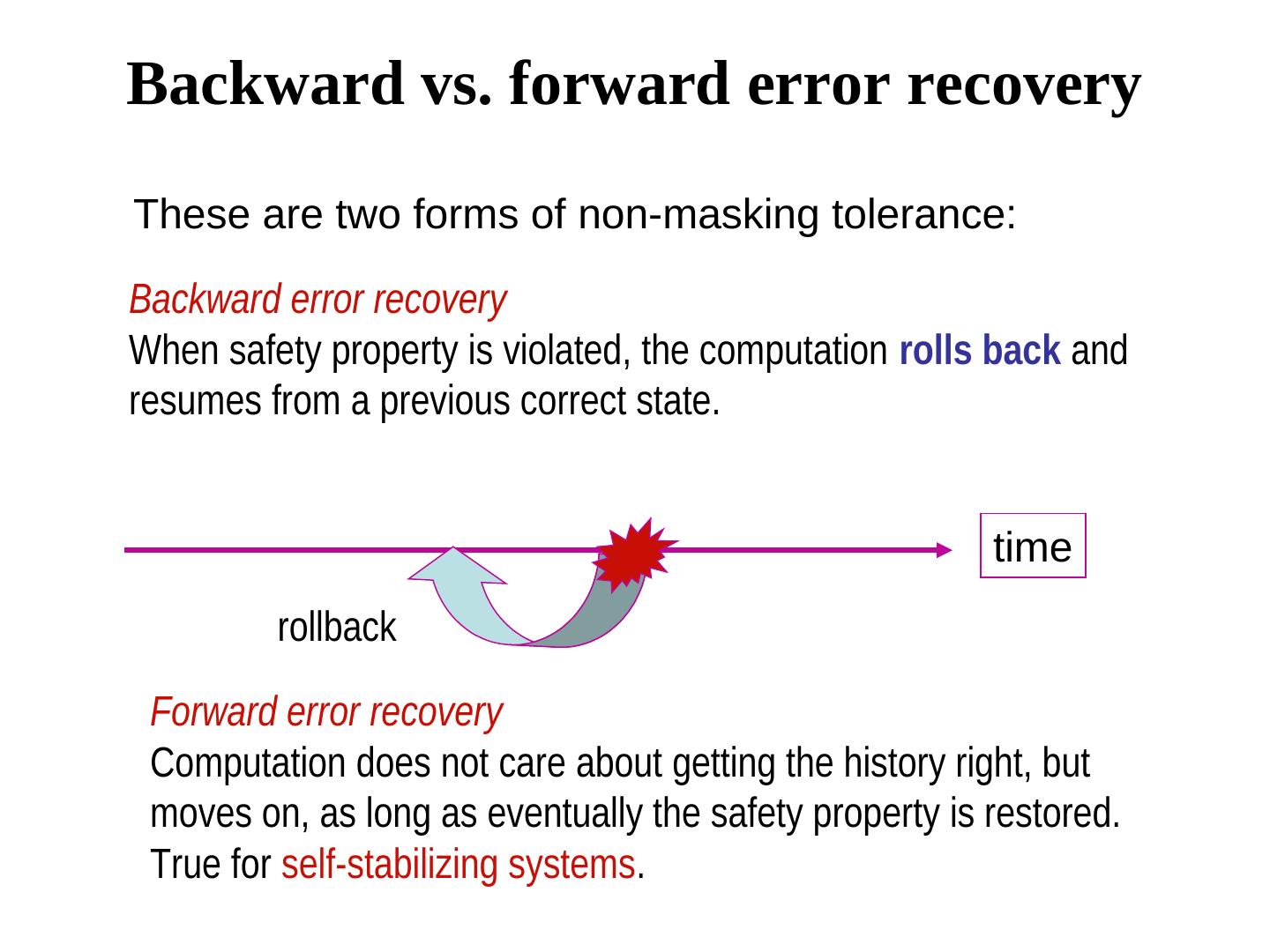 19 .Backward vs. forward error recovery These are two forms of non-masking tolerance: Backward error recovery When safety property is violated, the computation rolls back and resumes from a previous correct state. time rollback Forward error recovery Computation does not care about getting the history right, but moves on, as long as eventually the safety property is restored. True for self-stabilizing systems.