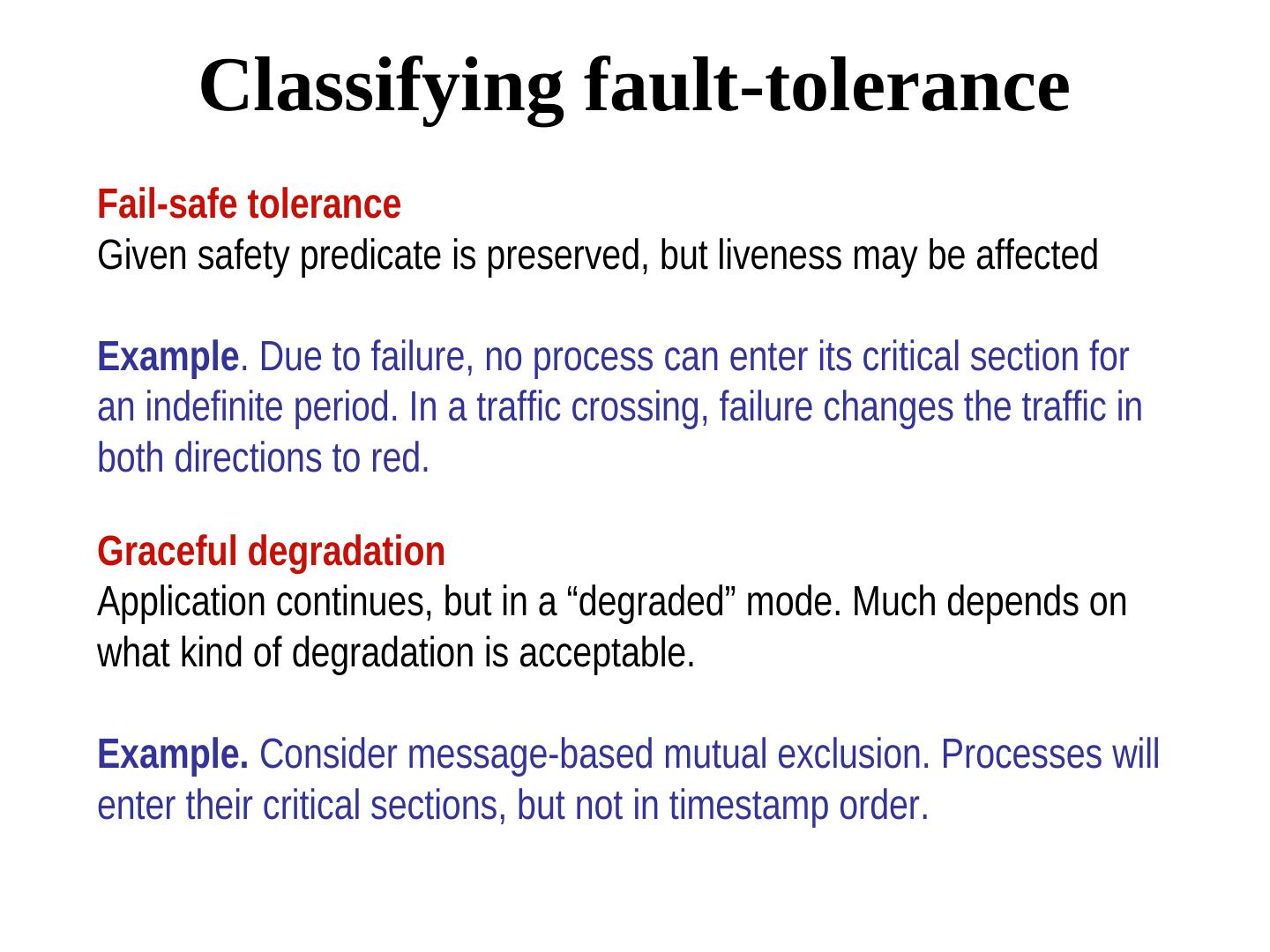 20 . Classifying fault-tolerance Fail-safe tolerance Given safety predicate is preserved, but liveness may be affected Example. Due to failure, no process can enter its critical section for an indefinite period. In a traffic crossing, failure changes the traffic in both directions to red. Graceful degradation Application continues, but in a “degraded” mode. Much depends on what kind of degradation is acceptable. Example. Consider message-based mutual exclusion. Processes will enter their critical sections, but not in timestamp order.