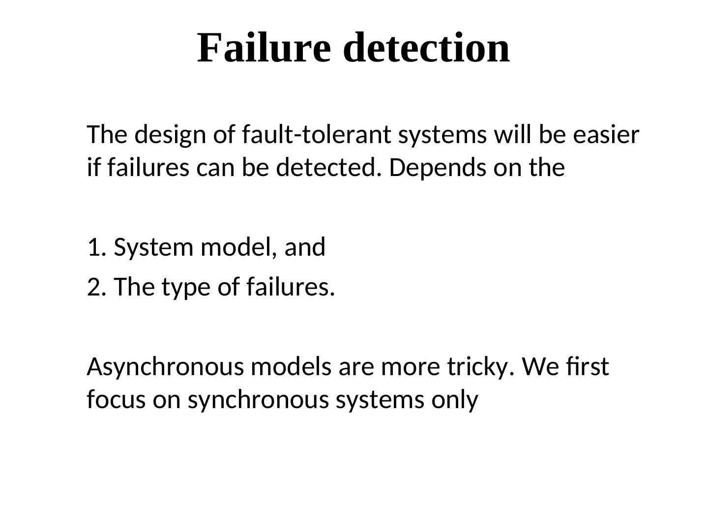 21 . Failure detection The design of fault-tolerant systems will be easier if failures can be detected. Depends on the 1. System model, and 2. The type of failures. Asynchronous models are more tricky. We first focus on synchronous systems only