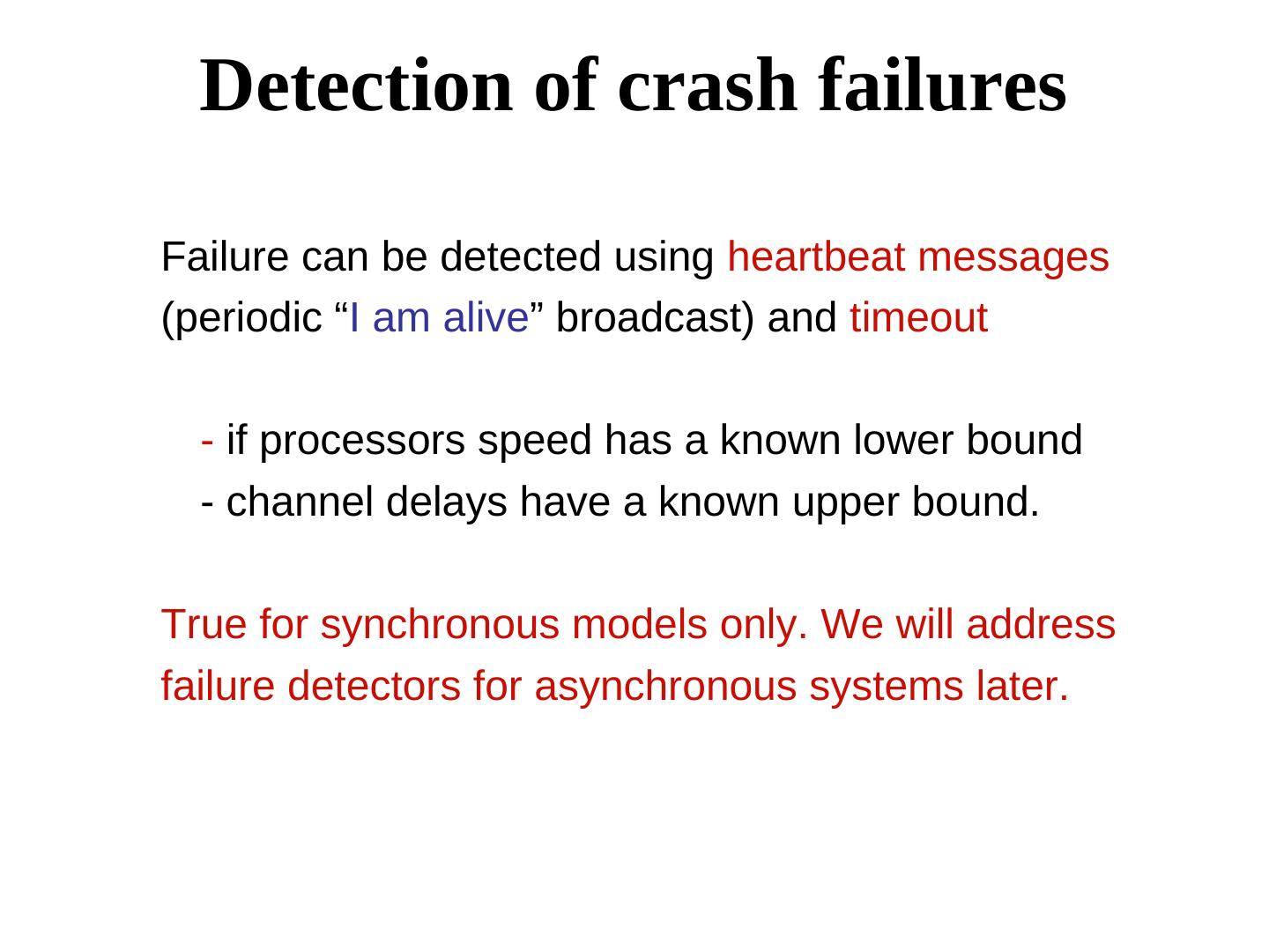 22 . Detection of crash failures Failure can be detected using heartbeat messages (periodic “I am alive” broadcast) and timeout - if processors speed has a known lower bound - channel delays have a known upper bound. True for synchronous models only. We will address failure detectors for asynchronous systems later.