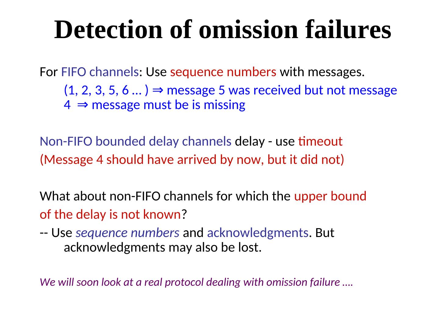 23 . Detection of omission failures For FIFO channels: Use sequence numbers with messages. (1, 2, 3, 5, 6 … ) ⇒ message 5 was received but not message message 5 was received but not message 4 ⇒ message 5 was received but not message message must be is missing Non-FIFO bounded delay channels delay - use timeout (Message 4 should have arrived by now, but it did not) What about non-FIFO channels for which the upper bound of the delay is not known? -- Use sequence numbers and acknowledgments. But acknowledgments may also be lost. We will soon look at a real protocol dealing with omission failure ….