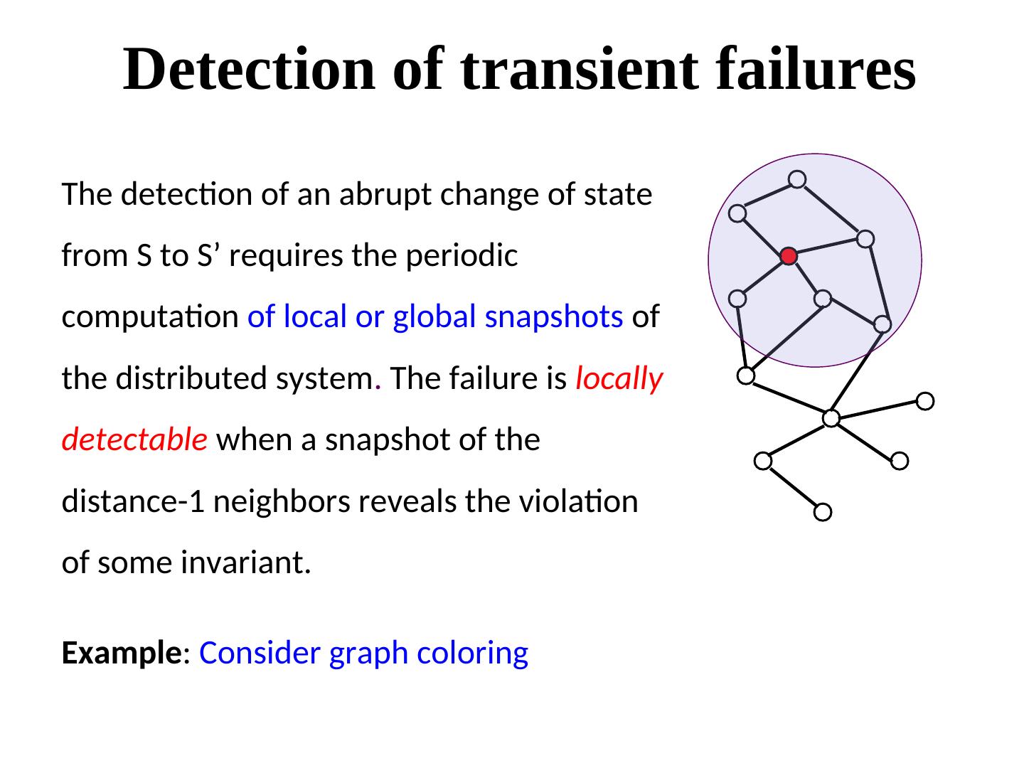 24 . Detection of transient failures The detection of an abrupt change of state from S to S’ requires the periodic computation of local or global snapshots of the distributed system. The failure is locally detectable when a snapshot of the distance-1 neighbors reveals the violation of some invariant. Example: Consider graph coloring