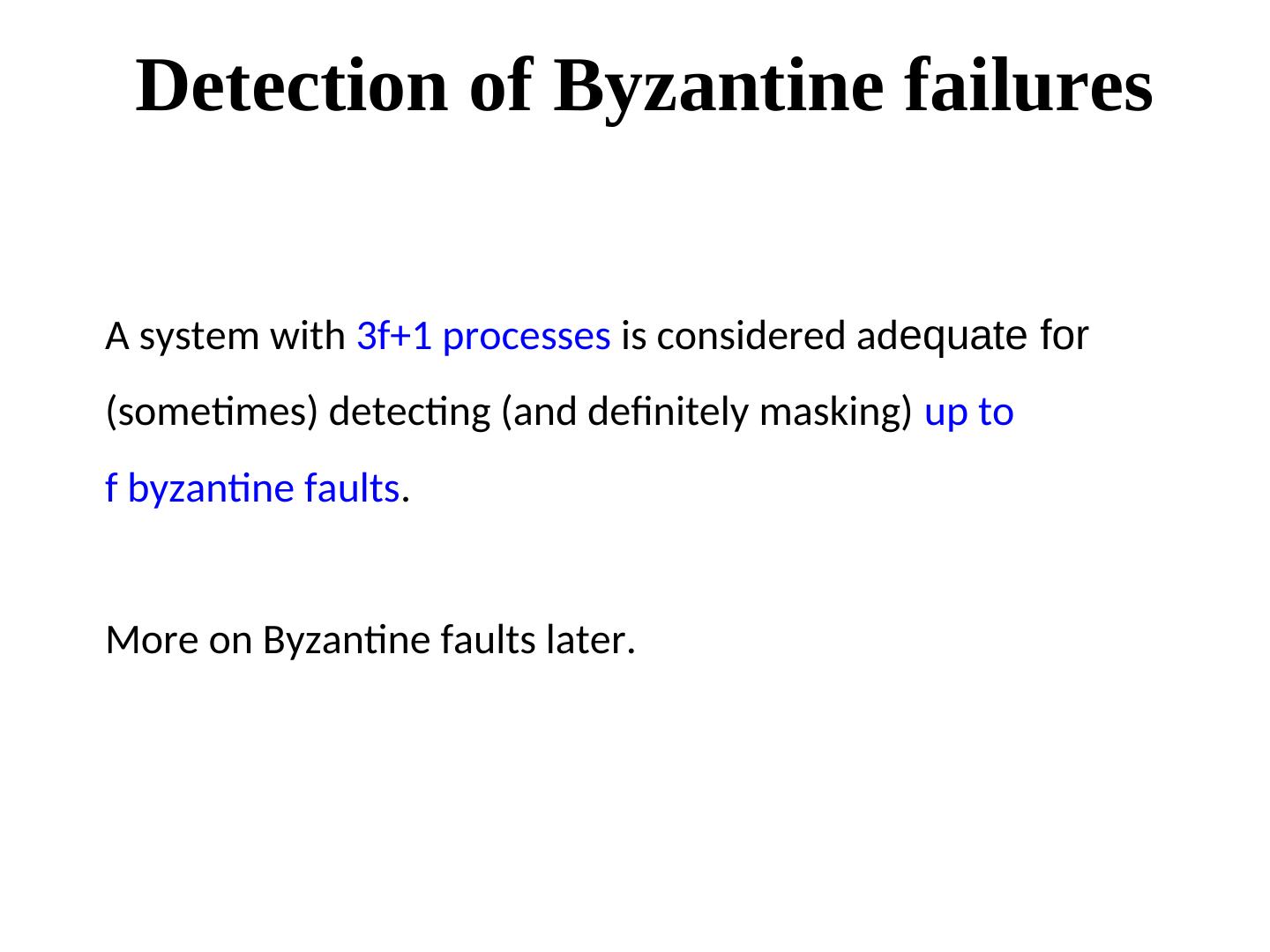 25 . Detection of Byzantine failures A system with 3f+1 processes is considered adequate for (sometimes) detecting (and definitely masking) up to f byzantine faults. More on Byzantine faults later.