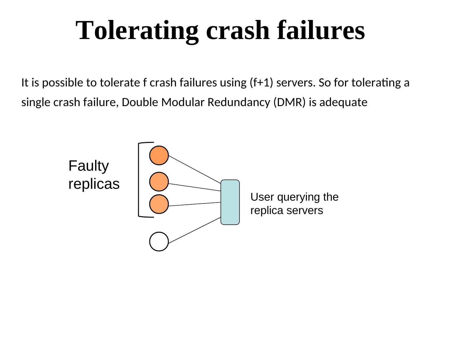 26 . Tolerating crash failures It is possible to tolerate f crash failures using (f+1) servers. So for tolerating a single crash failure, Double Modular Redundancy (DMR) is adequate Faulty replicas User querying the replica servers
