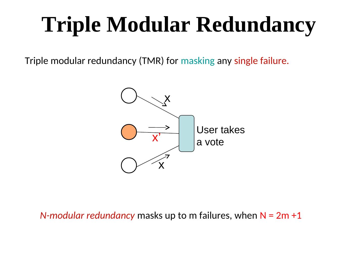 27 . Triple Modular Redundancy Triple modular redundancy (TMR) for masking any single failure. x User takes x’ a vote x N-modular redundancy masks up to m failures, when N = 2m +1