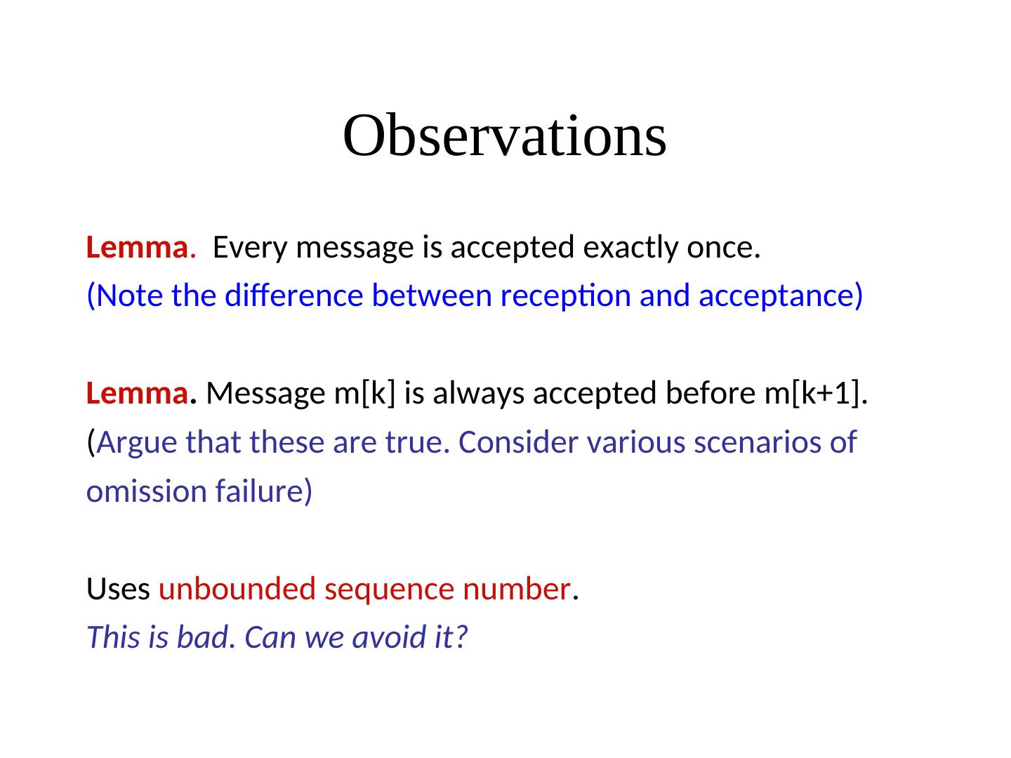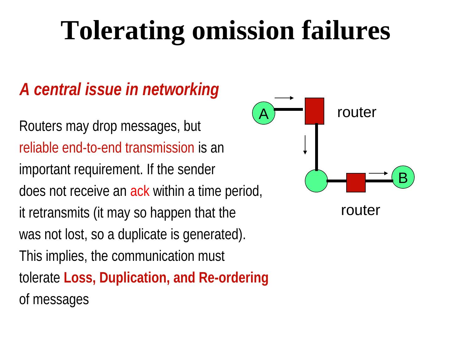 28 . Tolerating omission failures A central issue in networking A router Routers may drop messages, but reliable end-to-end transmission is an important requirement. If the sender B does not receive an ack within a time period, it retransmits (it may so happen that the router was not lost, so a duplicate is generated). This implies, the communication must tolerate Loss, Duplication, and Re-ordering of messages