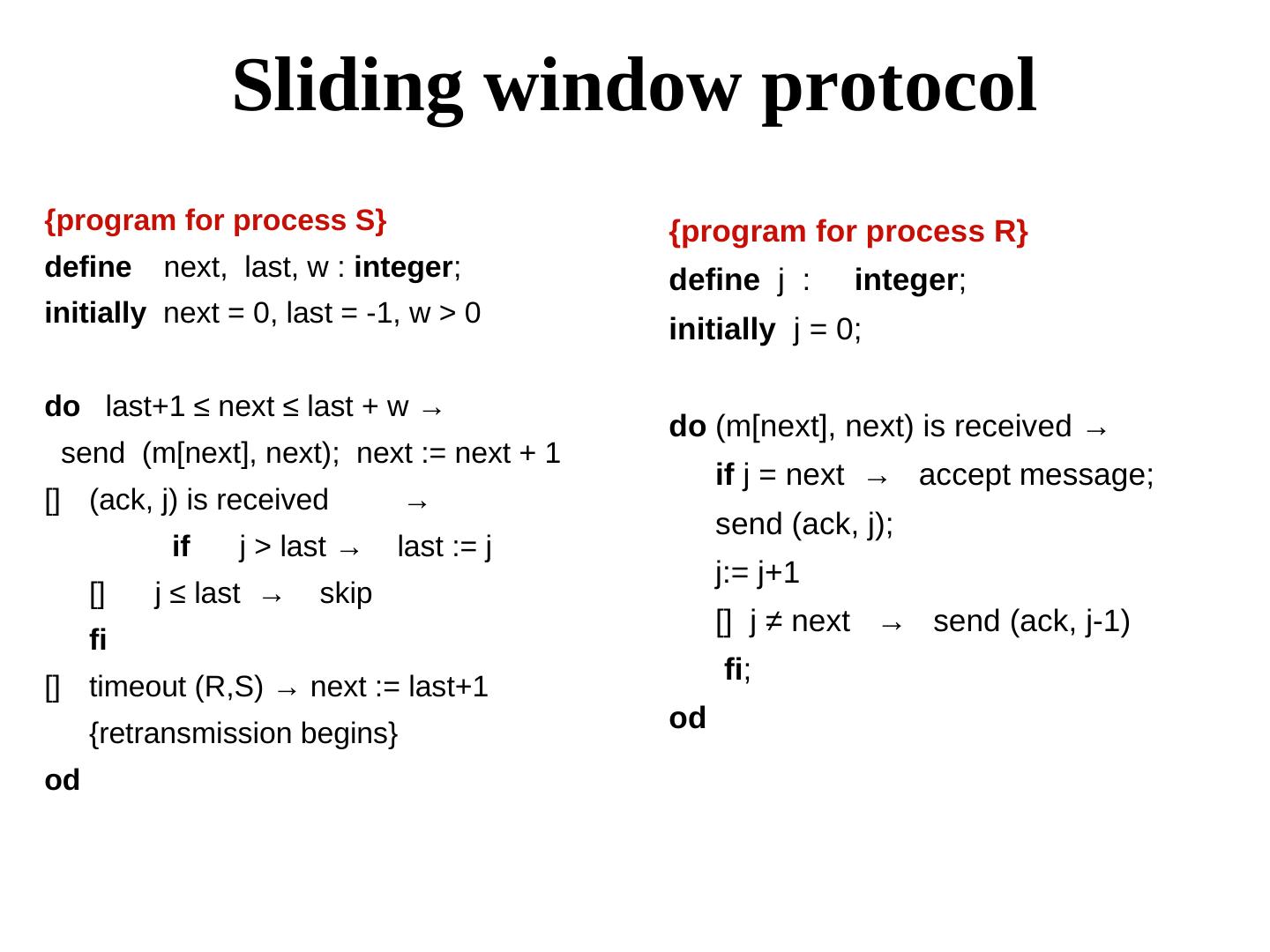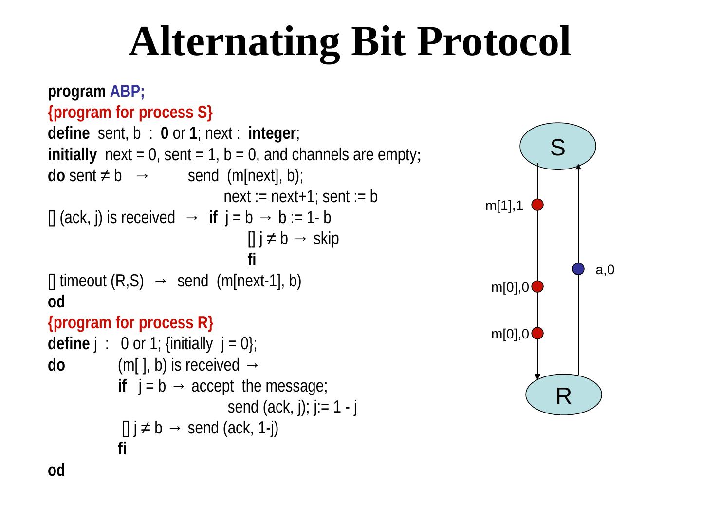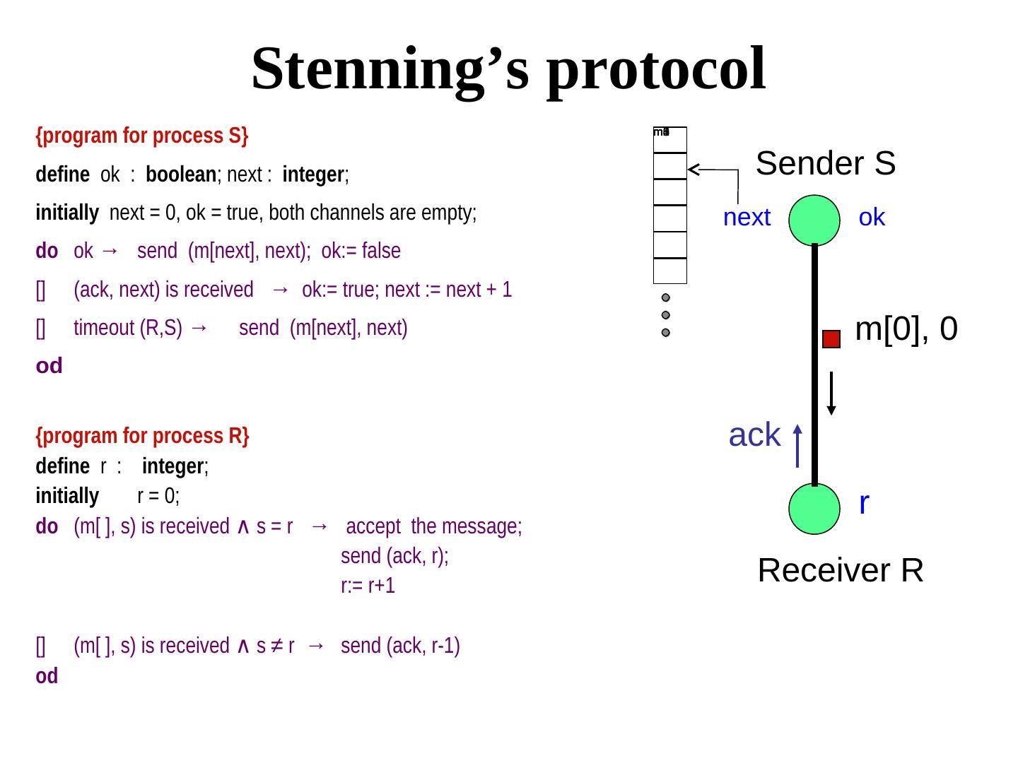 29 . Stenning’s protocol {program for process S} m5 m4 m3 m2 m1 m0 define ok : boolean; next : integer; Sender S initially next = 0, ok = true, both channels are empty; next ok do ok → send (m[next], next); ok:= false [] (ack, next) is received → ok:= true; next := next + 1 [] timeout (R,S) → send (m[next], next) m[0], 0 od {program for process R} ack define r : integer; initially r = 0; r do (m[ ], s) is received ∧ s = r → accept the message; s = r → accept the message; send (ack, r); r:= r+1 Receiver R [] (m[ ], s) is received ∧ s = r → accept the message; s ≠ r → send (ack, r-1) od