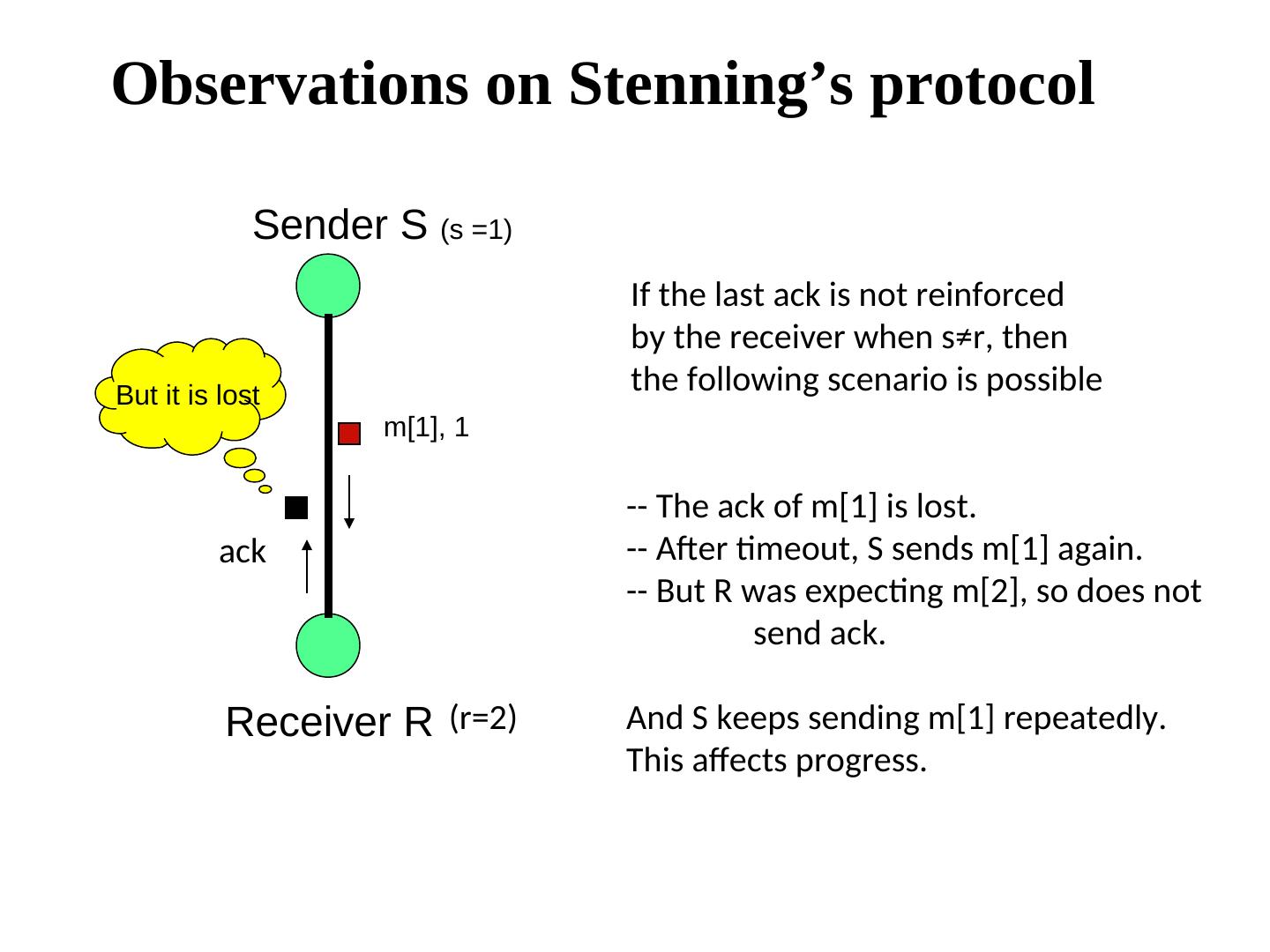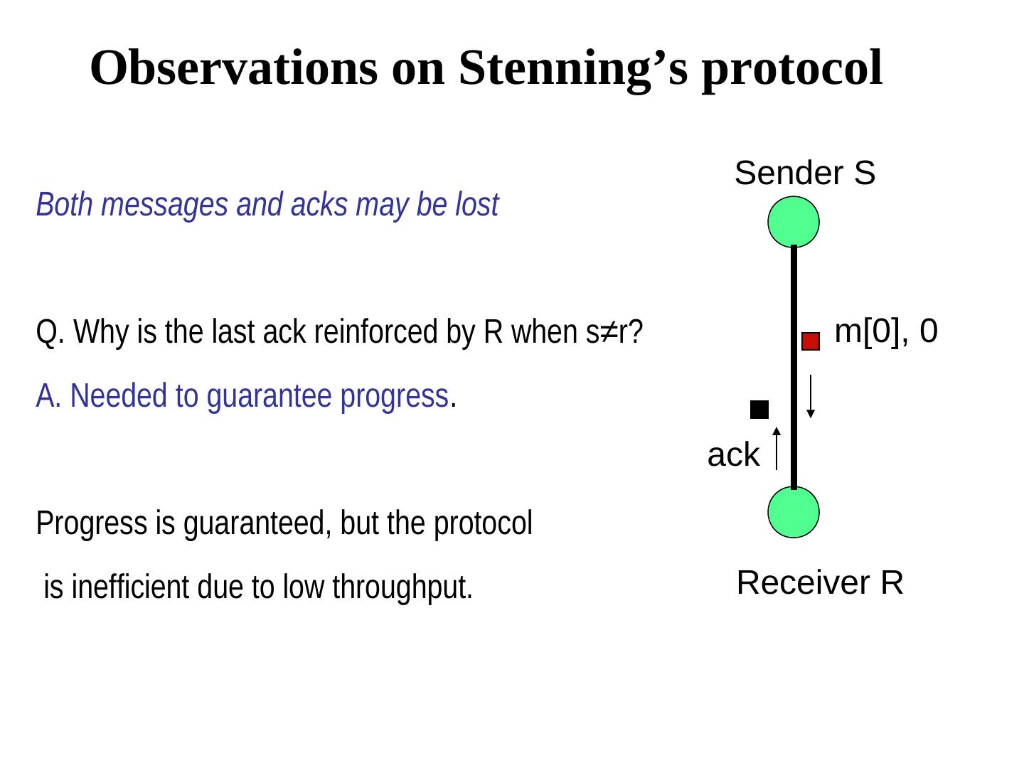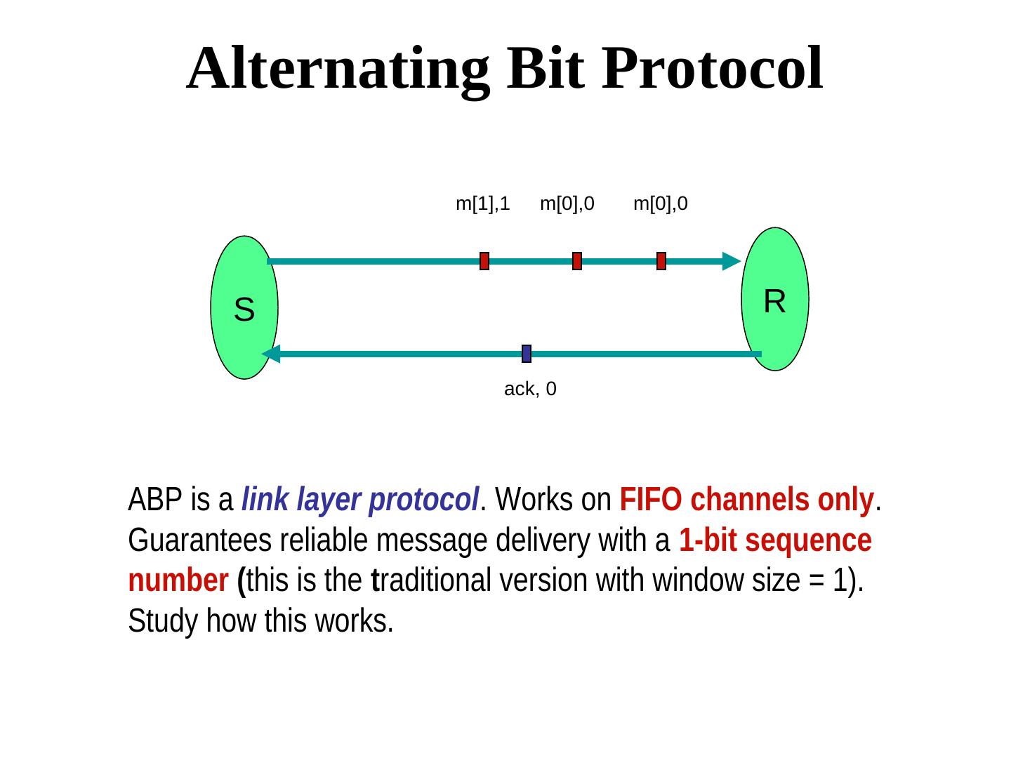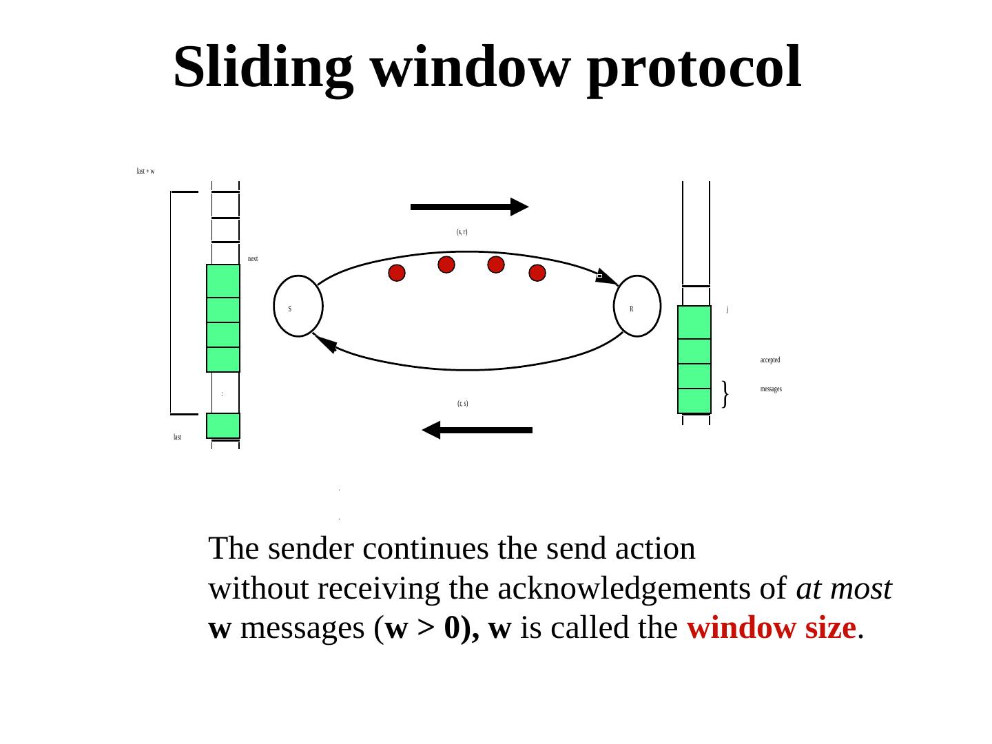 29 . Stenning’s protocol {program for process S} m5 m4 m3 m2 m1 m0 define ok : boolean; next : integer; Sender S initially next = 0, ok = true, both channels are empty; next ok do ok → send (m[next], next); ok:= false [] (ack, next) is received → ok:= true; next := next + 1 [] timeout (R,S) → send (m[next], next) m[0], 0 od {program for process R} ack define r : integer; initially r = 0; r do (m[ ], s) is received ∧ s = r → accept the message; s = r → accept the message; send (ack, r); r:= r+1 Receiver R [] (m[ ], s) is received ∧ s = r → accept the message; s ≠ r → send (ack, r-1) od