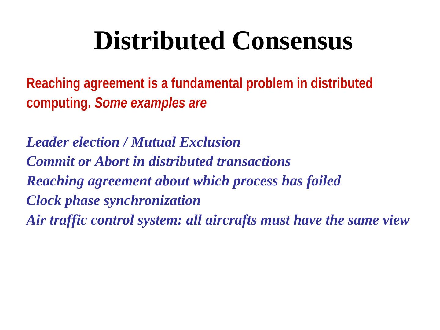 2 . Distributed Consensus Reaching agreement is a fundamental problem in distributed computing. Some examples are Leader election / Mutual Exclusion Commit or Abort in distributed transactions Reaching agreement about which process has failed Clock phase synchronization Air traffic control system: all aircrafts must have the same view