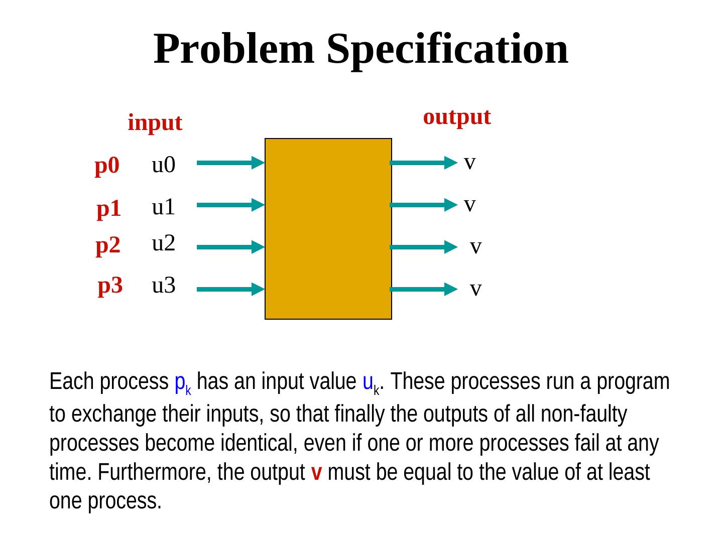 3 . Problem Specification input output p0 u0 v p1 u1 v p2 u2 v p3 u3 v Each process pk has an input value uk. These processes run a program to exchange their inputs, so that finally the outputs of all non-faulty processes become identical, even if one or more processes fail at any time. Furthermore, the output v must be equal to the value of at least one process.