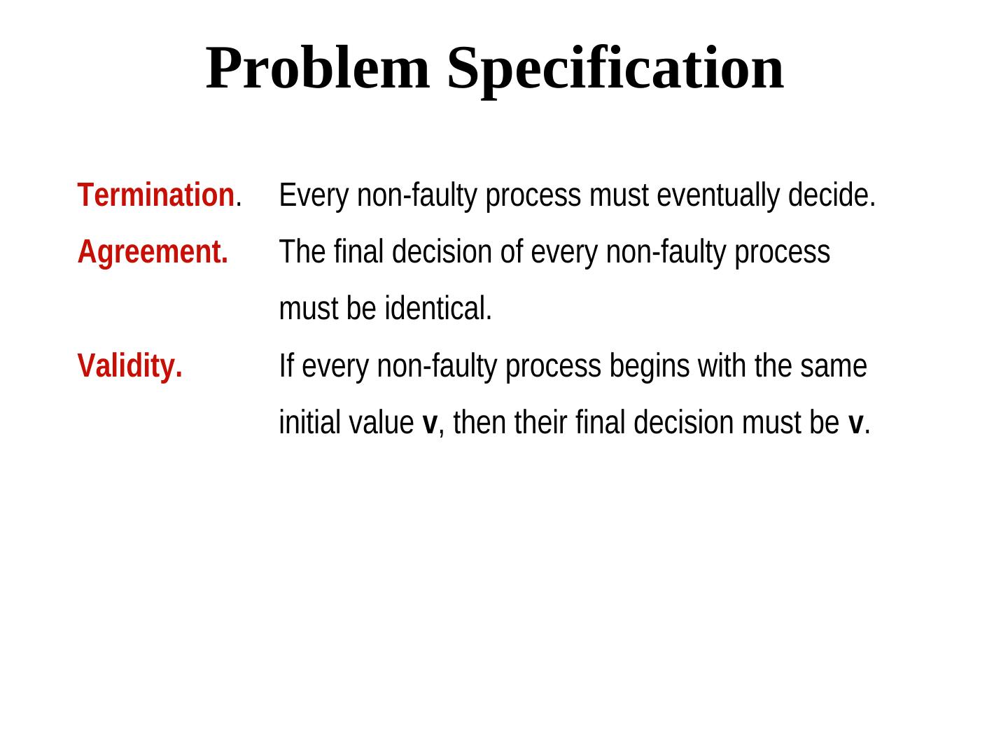 4 . Problem Specification Termination. Every non-faulty process must eventually decide. Agreement. The final decision of every non-faulty process must be identical. Validity. If every non-faulty process begins with the same initial value v, then their final decision must be v.