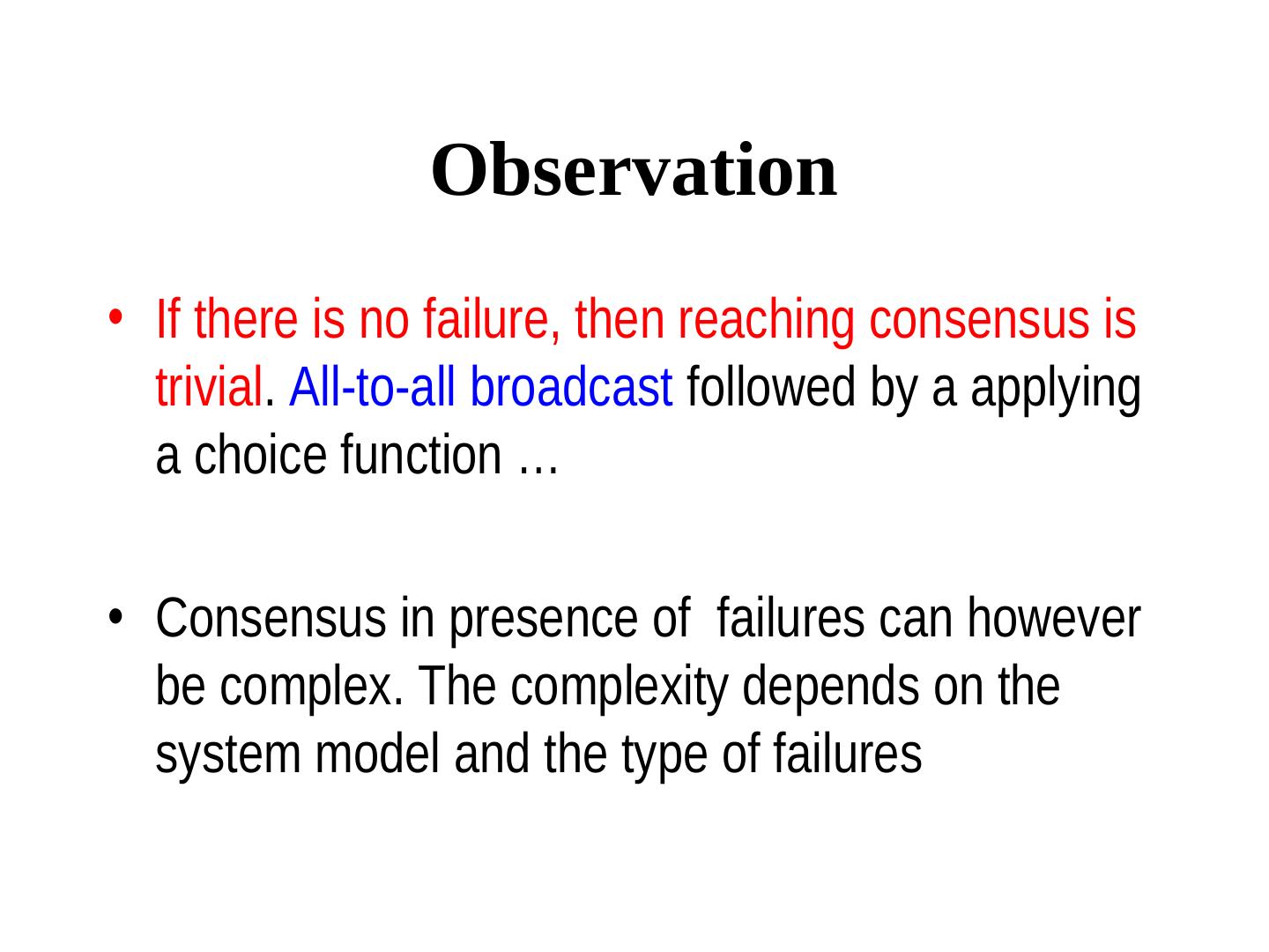 5 . Observation • If there is no failure, then reaching consensus is trivial. All-to-all broadcast followed by a applying a choice function … • Consensus in presence of failures can however be complex. The complexity depends on the system model and the type of failures