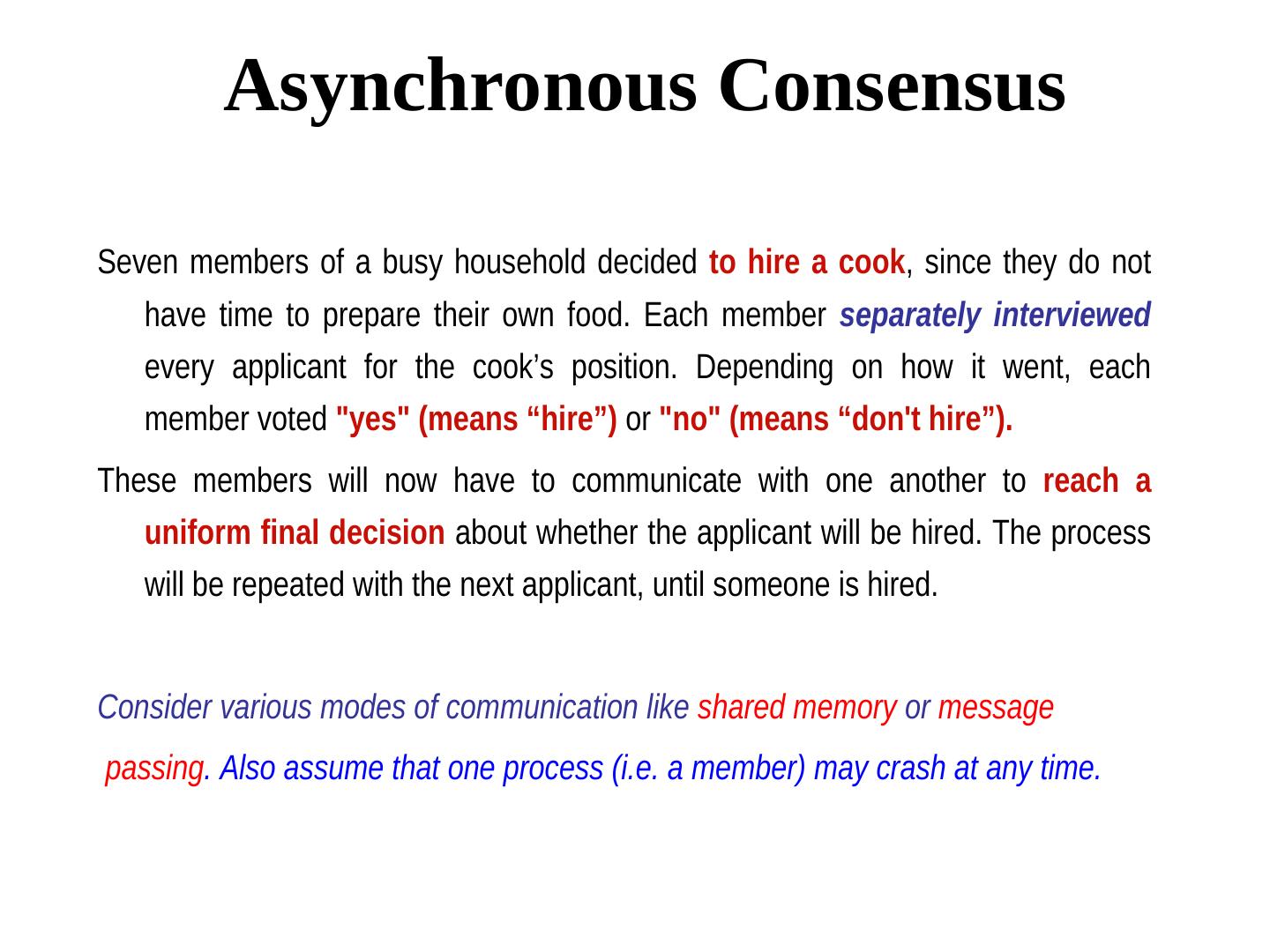6 . Asynchronous Consensus Seven members of a busy household decided to hire a cook, since they do not have time to prepare their own food. Each member separately interviewed every applicant for the cook’s position. Depending on how it went, each member voted "yes" (means “hire”) or "no" (means “don't hire”). These members will now have to communicate with one another to reach a uniform final decision about whether the applicant will be hired. The process will be repeated with the next applicant, until someone is hired. Consider various modes of communication like shared memory or message passing. Also assume that one process (i.e. a member) may crash at any time.