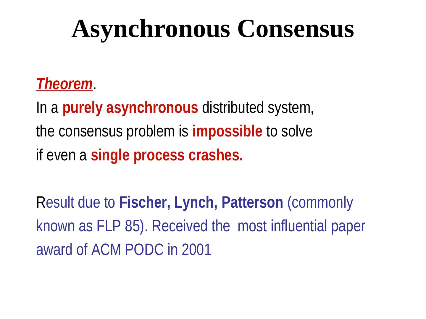 7 . Asynchronous Consensus Theorem. In a purely asynchronous distributed system, the consensus problem is impossible to solve if even a single process crashes. Result due to Fischer, Lynch, Patterson (commonly known as FLP 85). Received the most influential paper award of ACM PODC in 2001
