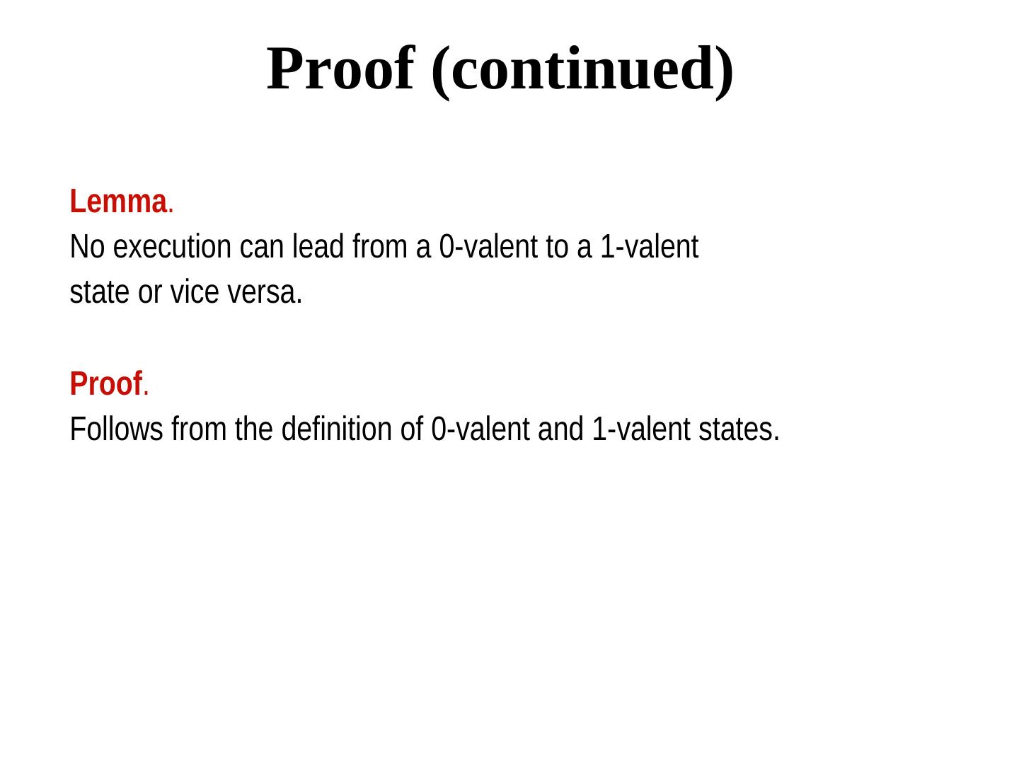 9 . Proof (continued) Lemma. No execution can lead from a 0-valent to a 1-valent state or vice versa. Proof. Follows from the definition of 0-valent and 1-valent states.